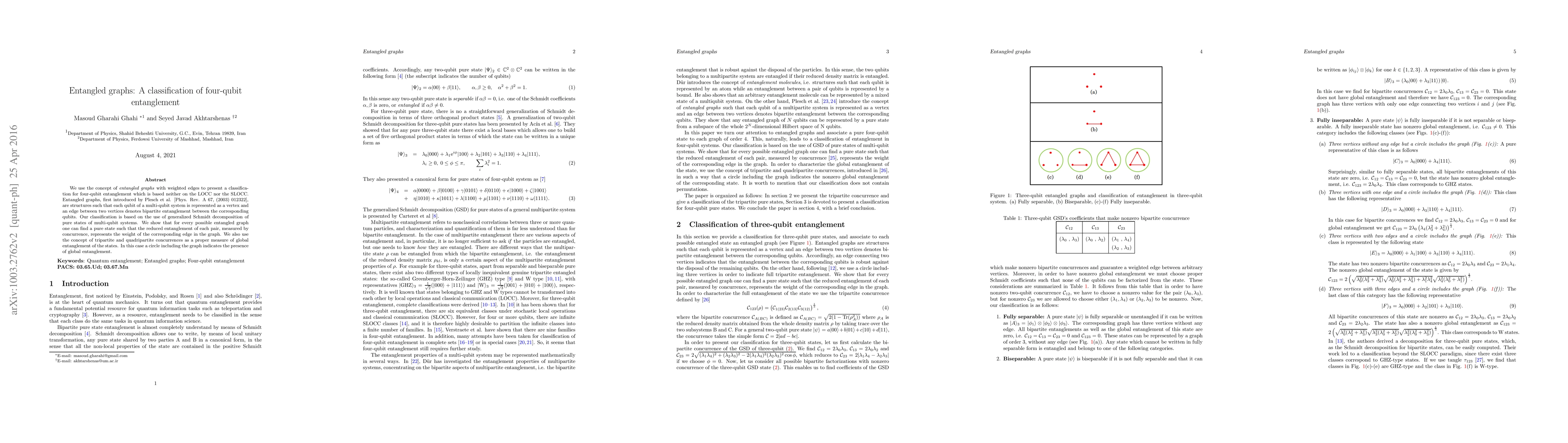 This research classifies four-qubit entanglement using entangled graphs, where each qubit is a vertex and edges represent bipartite entanglement. The classification is based on generalized Schmidt decomposition and measures global entanglement through tripartite and quadripartite concurrences, using concurrence weights and a circle to indicate global entanglement presence.