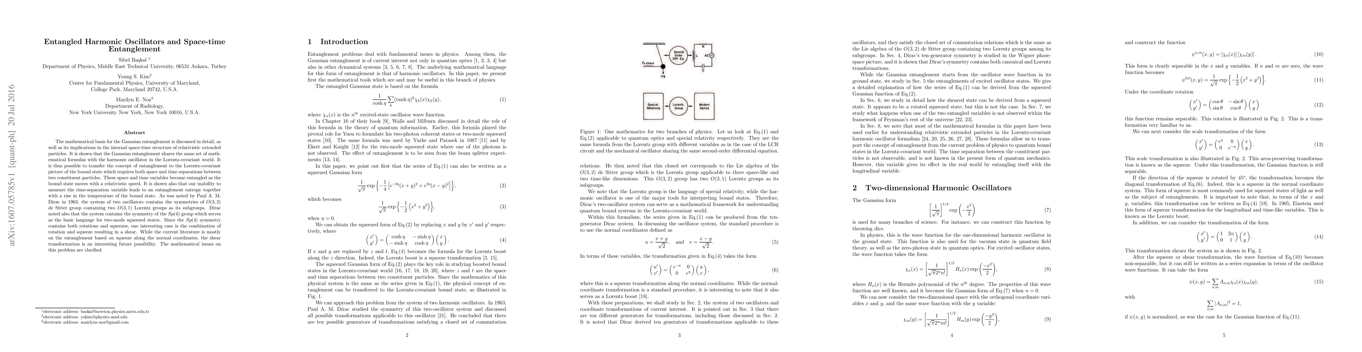 The mathematical basis for the Gaussian entanglement is discussed in detail, as well as its implications in the internal space-time structure of relativistic extended particles. It is shown that the Gaussian entanglement shares the same set of mathematical formulas with the harmonic oscillator in the Lorentz-covariant world. It is thus possible to transfer the concept of entanglement to the Lorentz-covariant picture of the bound state which requires both space and time separations between two constituent particles. These space and time variables become entangled as the bound state moves with a relativistic speed. It is shown also that our inability to measure the time-separation variable leads to an entanglement entropy together with a rise in the temperature of the bound state. As was noted by Paul A. M. Dirac in 1963, the system of two oscillators contains the symmetries of O(3,2) de Sitter group containing two O(3,1) Lorentz groups as its subgroups. Dirac noted also that the system contains the symmetry of the Sp(4) group which serves as the basic language for two-mode squeezed states. Since the Sp(4) symmetry contains both rotations and squeezes, one interesting case is the combination of rotation and squeeze resulting in a shear. While the current literature is mostly on the entanglement based on squeeze along the normal coordinates, the shear transformation is an interesting future possibility. The mathematical issues on this problem are clarified.