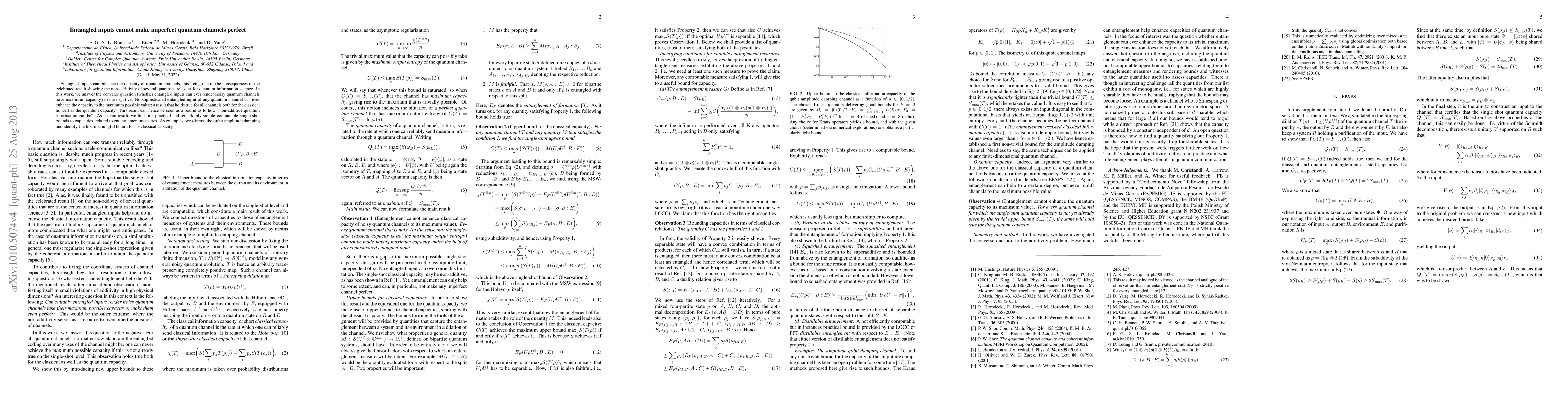 This paper demonstrates that entangled inputs cannot improve the capacity of imperfect quantum channels to their maximum possible value, establishing a fundamental limit on the non-additivity of quantum information. It also provides practical computable single-shot bounds for capacities related to entanglement measures, with specific examples like the qubit amplitude damping channel.