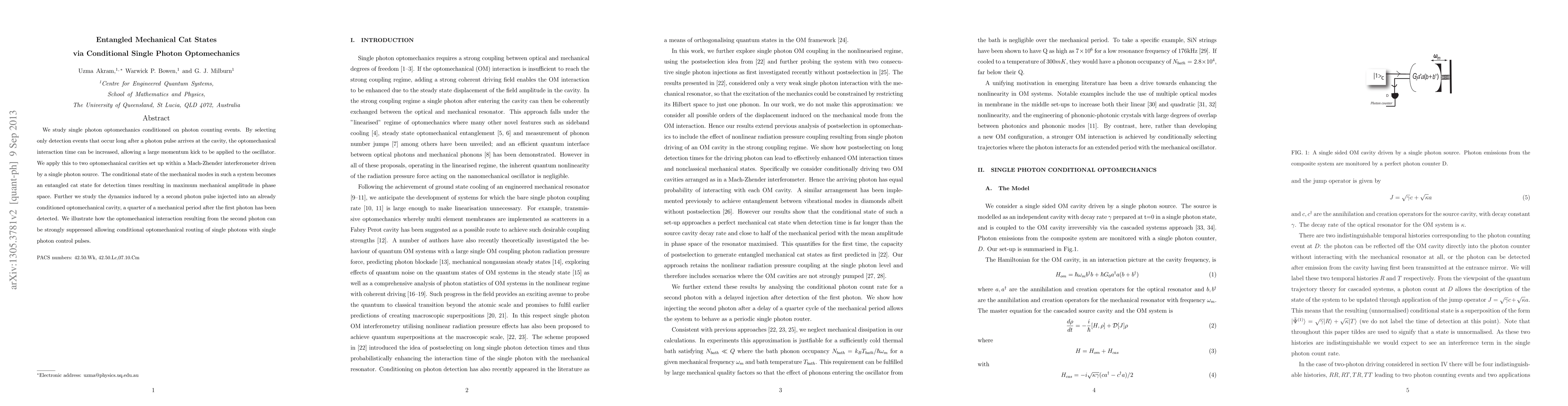 This paper explores the generation of entangled mechanical cat states through conditional single photon optomechanics, achieving a large momentum kick by extending interaction time. The study also demonstrates conditional optomechanical routing of single photons using a Mach-Zhender interferometer setup.