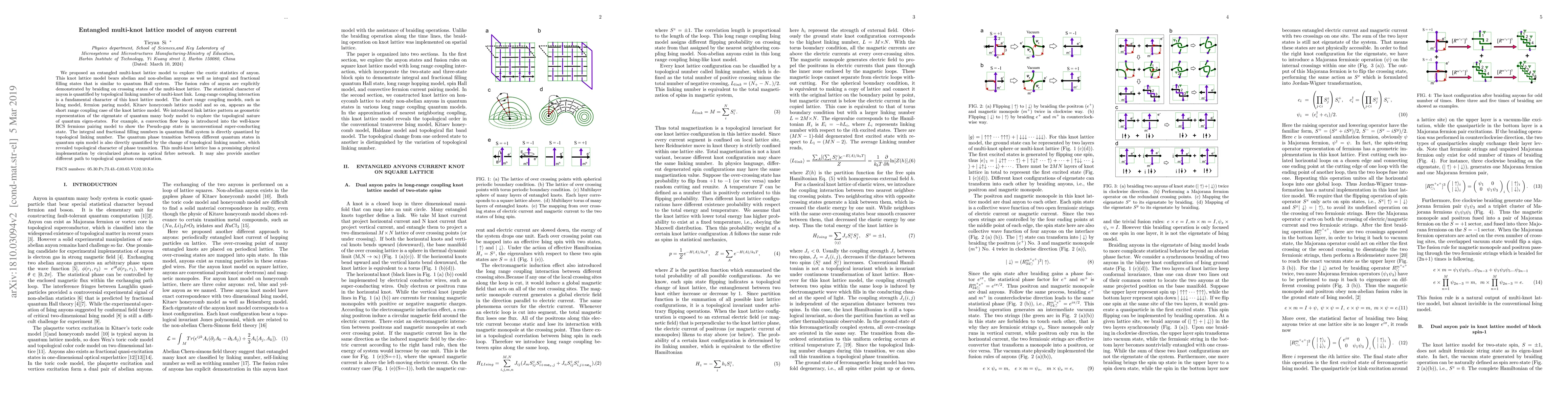 We proposed an entangled multi-knot lattice model to explore the exotic statistics of anyon. This knot lattice model bears abelian and non-abelian anyons as well as integral and fractional filling states that is similar to quantum Hall system. The fusion rules of anyon are explicitly demonstrated by braiding on crossing states of the multi-knot lattice. The statistical character of anyon is quantified by topological linking number of multi-knot link. Long-range coupling interaction is a fundamental character of this knot lattice model. The short range coupling models, such as Ising model, fermion paring model, Kitaev honeycomb lattice model and so on, appears as the short range coupling case of the knot lattice model. We introduced link lattice pattern as geometric representation of the eigenstate of quantum many body model to explore the topological nature of quantum eigen-states. For example, a convection flow loop is introduced into the well-know BCS fermions pairing model to show the Pseudo-gap state in unconventional super-conducting state. The integral and fractional filling numbers in quantum Hall system is directly quantized by topological linking number. The quantum phase transition between different quantum states in quantum spin model is also directly quantified by the change of topological linking number, which revealed topological character of phase transition. This multi-knot lattice has a promising physical implementation by circularized photons in optical firbre network. It may also provide another different path to topological quantum computation.