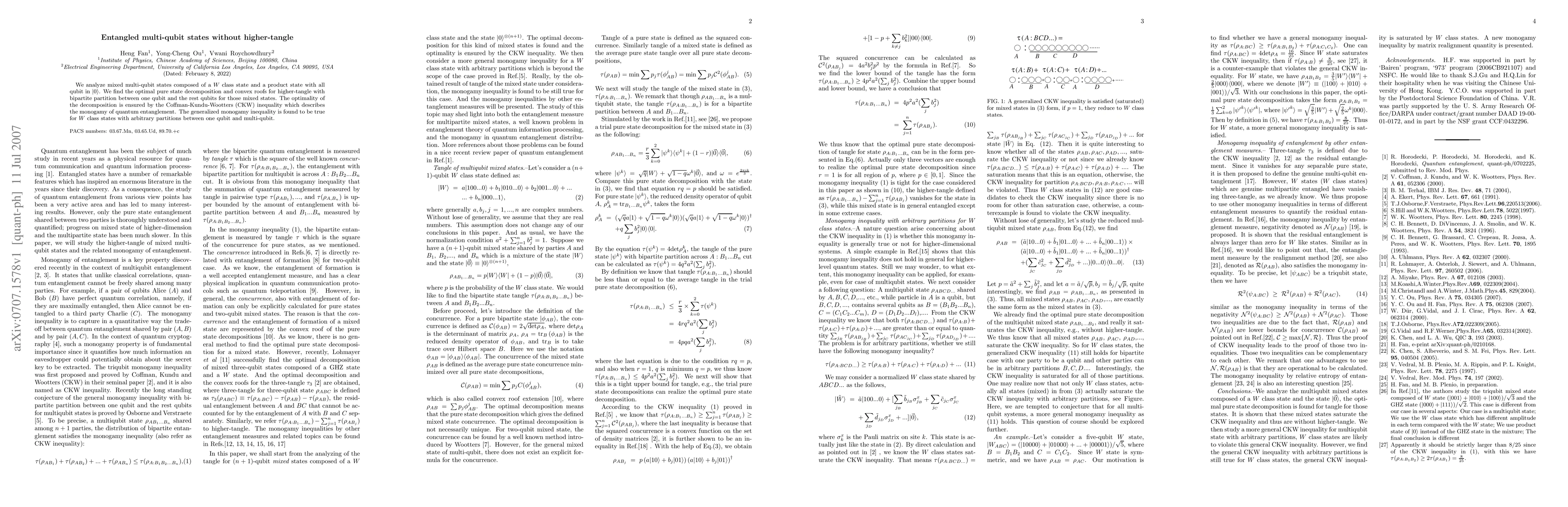We analyze mixed multi-qubit states composed of a W class state and a product state with all qubit in |0>. We find the optimal pure state decomposition and convex roofs for higher-tangle with bipartite partition between one qubit and the rest qubits for those mixed states. The optimality of the decomposition is ensured by the Coffman-Kundu-Wootters (CKW) inequality which describes the monogamy of quantum entanglement. The generalized monogamy inequality is found to be true for W class states with arbitrary partitions between one qubit and multi-qubit.