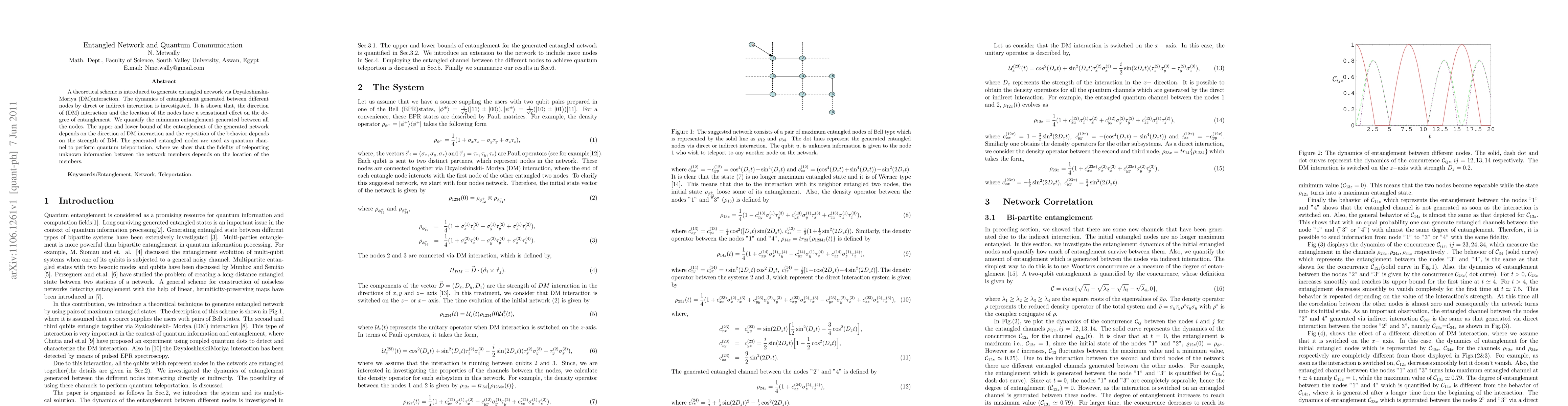A theoretical scheme is introduced to generate entangled network via Dzyaloshinskii- Moriya (DM)interaction. The dynamics of entanglement generated between different nodes by direct or indirect interaction is investigated. It is shown that, the direction of (DM) interaction and the location of the nodes have a sensational effect on the degree of entanglement. We quantify the minimum entanglement generated between all the nodes. The upper and lower bound of the entanglement of the generated network depends on the direction of DM interaction and the repetition of the behavior depends on the strength of DM. The generated entangled nodes are used as quantum channel to perform quantum teleportation, where we show that the fidelity of teleporting unknown information between the network members depends on the location of the members.