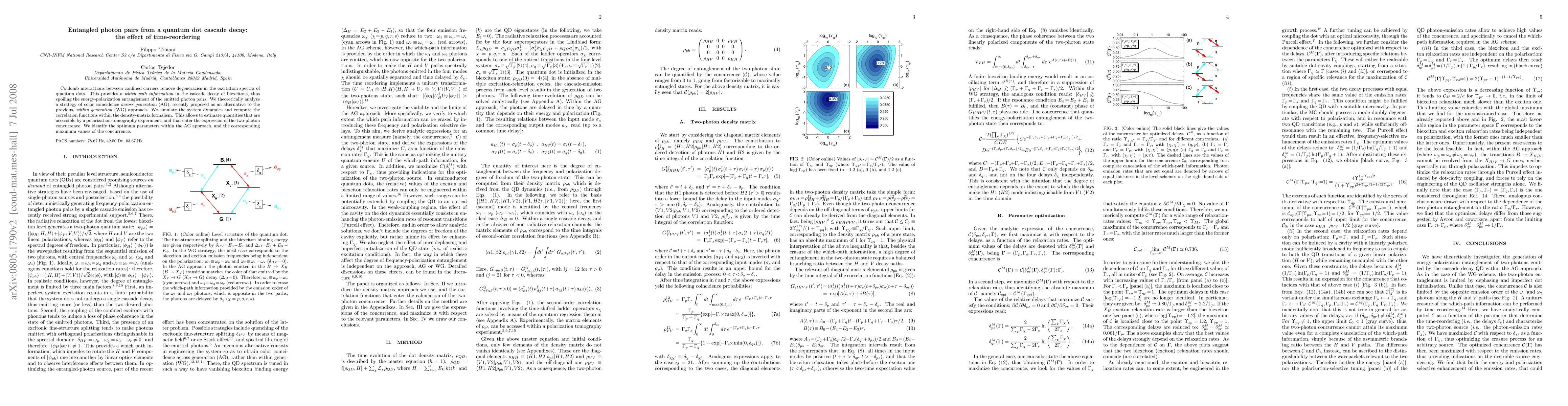 This paper investigates how Coulomb interactions affect the entanglement of photon pairs emitted from a quantum dot's cascade decay, proposing a color coincidence across generation (AG) strategy to mitigate the impact of time-reordering. The authors simulate the system dynamics and compute correlation functions to determine the maximum achievable concurrence, identifying optimal parameters for the AG approach.