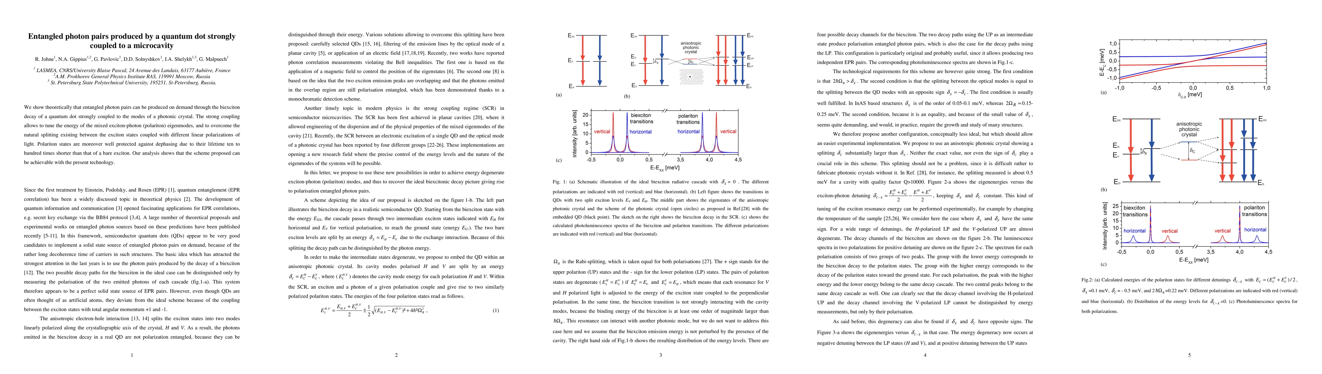 We show theoretically that entangled photon pairs can be produced on demand through the biexciton decay of a quantum dot strongly coupled to the modes of a photonic crystal. The strong coupling allows to tune the energy of the mixed exciton-photon (polariton) eigenmodes, and to overcome the natural splitting existing between the exciton states coupled with different linear polarizations of light. Polariton states are moreover well protected against dephasing due to their lifetime ten to hundred times shorter than that of a bare exciton. Our analysis shows that the scheme proposed can be achievable with the present technology.
