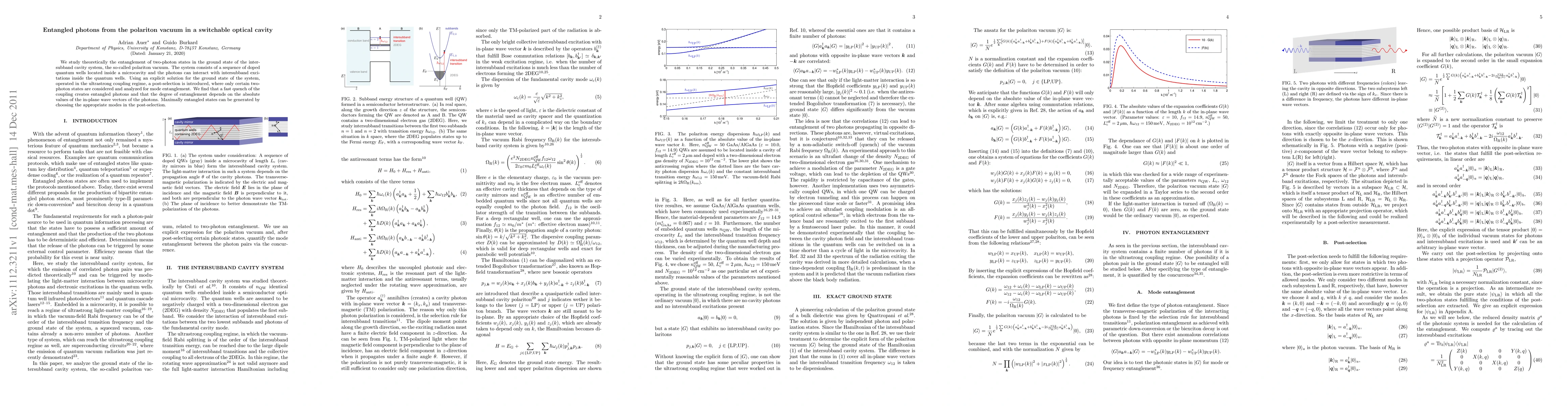 We study theoretically the entanglement of two-photon states in the ground state of the intersubband cavity system, the so-called polariton vacuum. The system consists of a sequence of doped quantum wells located inside a microcavity and the photons can interact with intersubband excitations inside the quantum wells. Using an explicit solution for the ground state of the system, operated in the ultrastrong coupling regime, a post-selection is introduced, where only certain two-photon states are considered and analyzed for mode entanglement. We find that a fast quench of the coupling creates entangled photons and that the degree of entanglement depends on the absolute values of the in-plane wave vectors of the photons. Maximally entangled states can be generated by choosing the appropriate modes in the post-selection.