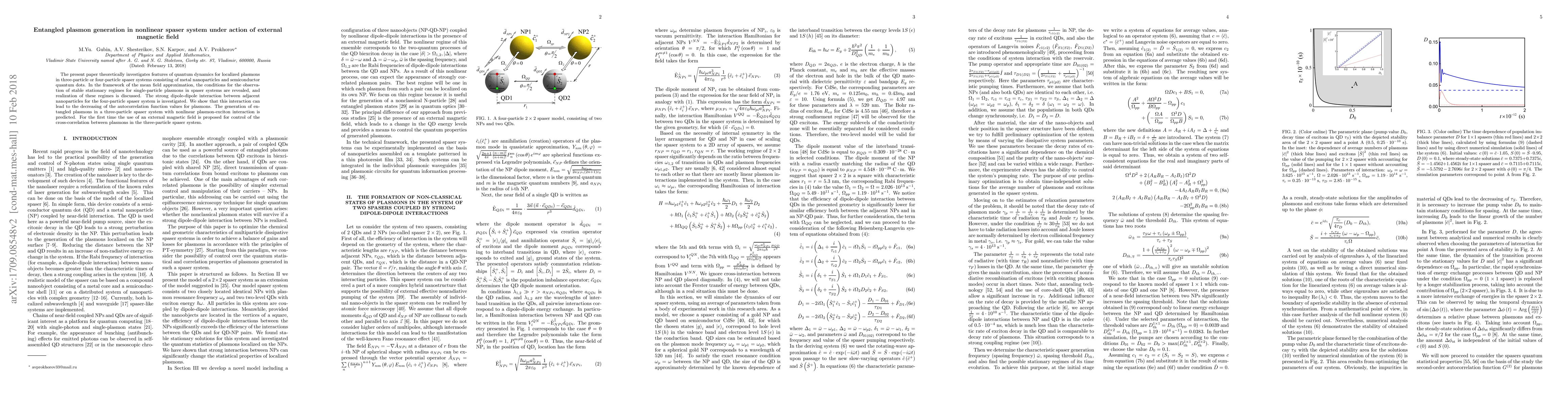 The present paper theoretically investigates features of quantum dynamics for localized plasmons in three-particle or four-particle spaser systems consisting of metal nanoparticles and semiconductor quantum dots. In the framework of the mean field approximation, the conditions for the observation of stable stationary regimes for single-particle plasmons in spaser systems are revealed, and realization of these regimes is discussed. The strong dipole-dipole interaction between adjacent nanoparticles for the four-particle spaser system is investigated. We show that this interaction can lead to the decreasing of the autocorrelation function values for plasmons. The generation of entangled plasmons in a three-particle spaser system with nonlinear plasmon-exciton interaction is predicted. For the first time the use of an external magnetic field is proposed for control of the cross-correlation between plasmons in the three-particle spaser system.