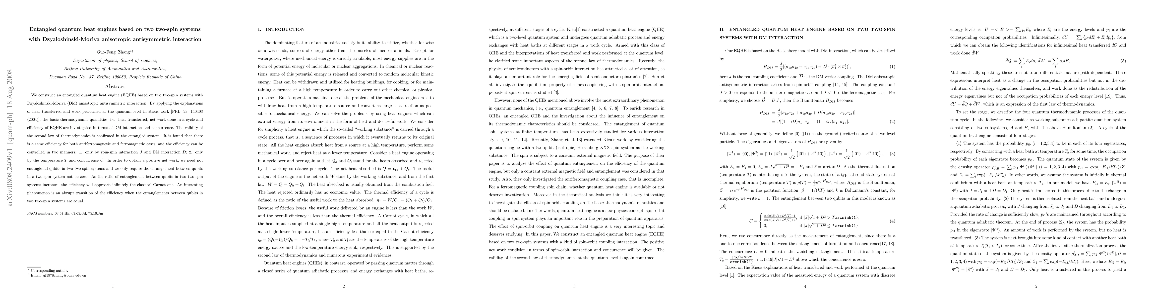 We construct an entangled quantum heat engine (EQHE) based on two two-spin systems with Dzyaloshinski-Moriya (DM) anisotropic antisymmetric interaction. By applying the explanations of heat transferred and work performed at the quantum level in Kieu's work [PRL, 93, 140403 (2004)], the basic thermodynamic quantities, i.e., heat transferred, net work done in a cycle and efficiency of EQHE are investigated in terms of DM interaction and concurrence. The validity of the second law of thermodynamics is confirmed in the entangled system. It is found that there is a same efficiency for both antiferromagnetic and ferromagnetic cases, and the efficiency can be controlled in two manners: 1. only by spin-spin interaction J and DM interaction D; 2. only by the temperature T and concurrence C. In order to obtain a positive net work, we need not entangle all qubits in two two-spin systems and we only require the entanglement between qubits in a two-spin system not be zero. As the ratio of entanglement between qubits in two two-spin systems increases, the efficiency will approach infinitely the classical Carnot one. An interesting phenomenon is an abrupt transition of the efficiency when the entanglements between qubits in two two-spin systems are equal.