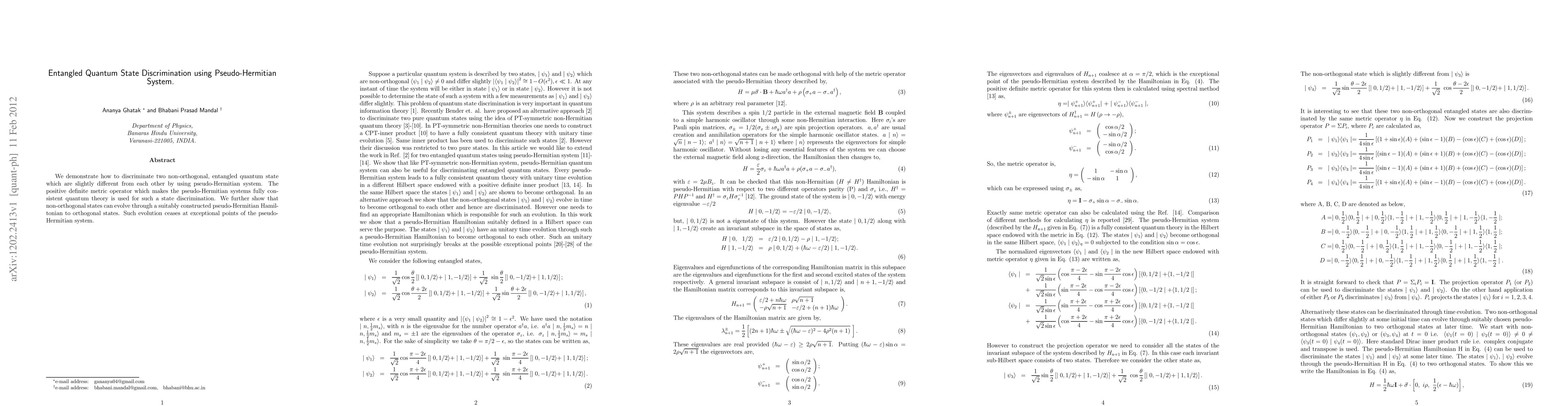 Researchers demonstrate a method to distinguish between two non-orthogonal entangled quantum states using pseudo-Hermitian systems, showing promise for efficient state discrimination and evolution in quantum systems.