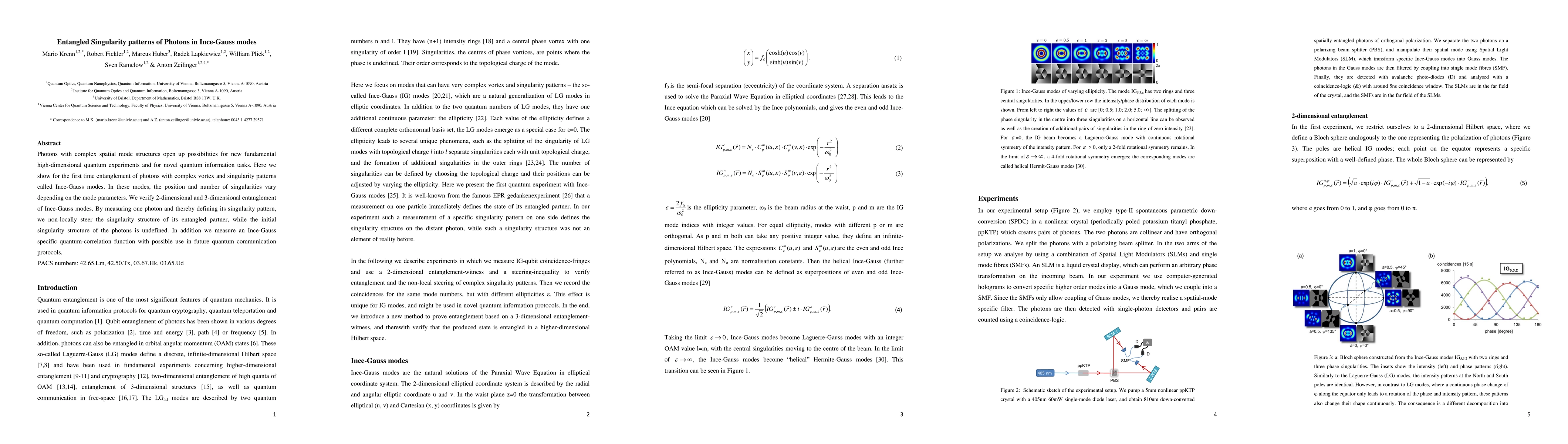 This paper demonstrates the entanglement of photons in Ince-Gauss modes, which possess complex vortex and singularity patterns. The study verifies 2D and 3D entanglement and shows non-local steering of singularity structures between entangled photons, with potential applications for future quantum communication protocols.