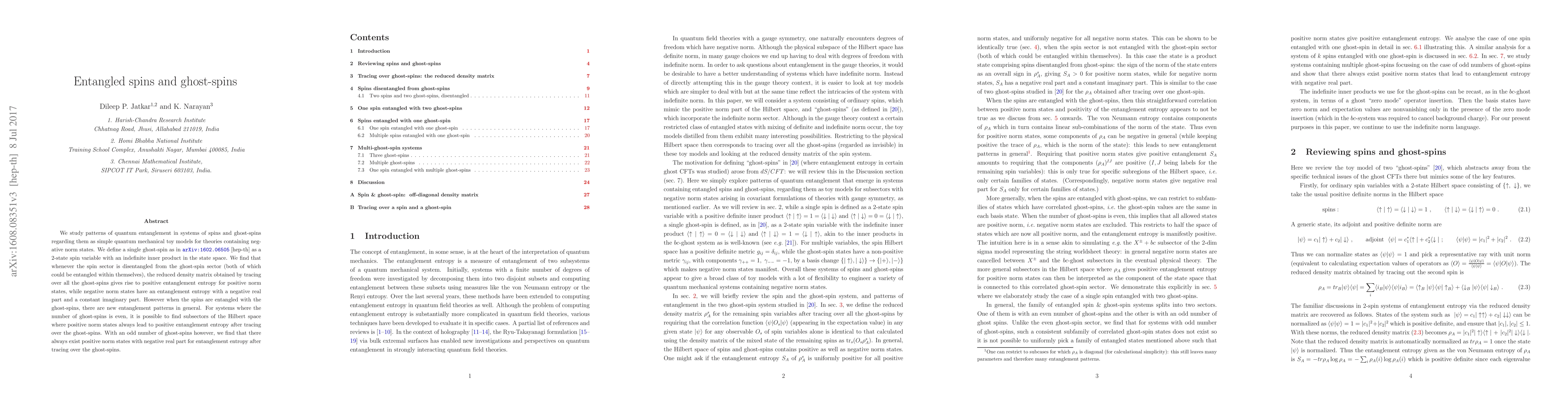 This research explores quantum entanglement patterns in spin and ghost-spin systems, treating ghost-spins as toy models for theories with negative norm states. It reveals that disentangled spin and ghost-spin sectors yield positive entanglement entropy for positive norm states and negative real part entropy for negative norm states. Entangled spins and ghost-spins exhibit new patterns. Even ghost-spin numbers allow for positive norm states with positive entropy after tracing over ghost-spins, while odd numbers always have positive norm states with a negative real part entropy post-tracing.