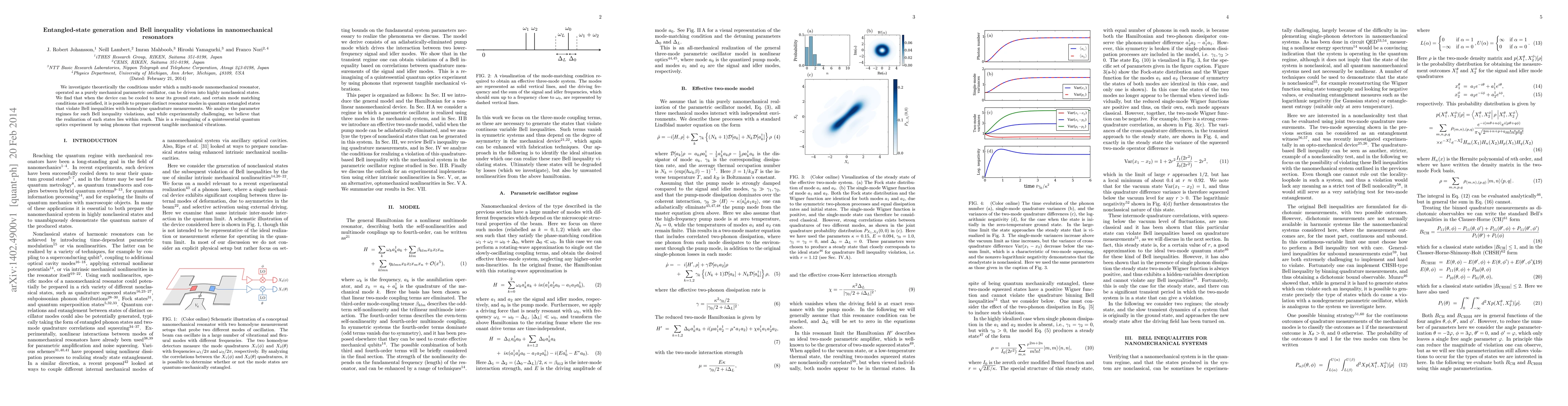 This paper explores the generation of entangled states and Bell inequality violations in multi-mode nanomechanical resonators operated as parametric oscillators. It finds that cooling the device to near its ground state and satisfying mode matching conditions can prepare entangled phonon states, violating Bell inequalities, though experimental realization remains challenging.
