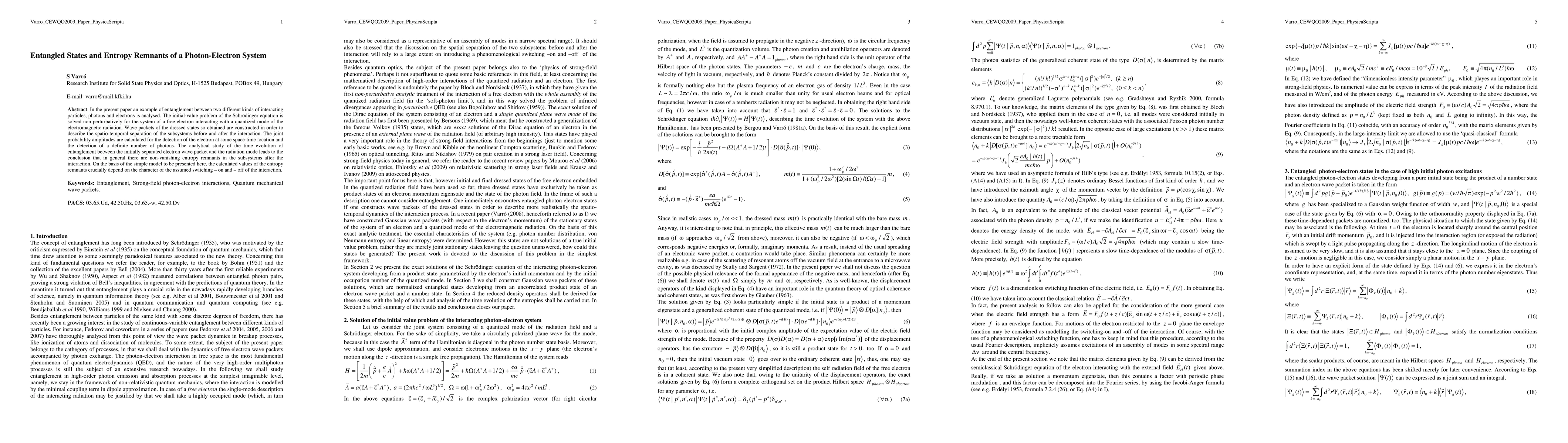 In the present paper an example of entanglement between two different kinds of interacting particles, photons and electrons is analysed. The initial-value problem of the Schroedinger equation is solved non-perturbatively for the system of a free electron interacting with a quantized mode of the electromagnetic radiation. Wave packets of the dressed states so obtained are constructed in order to describe the spatio-temporal separation of the subsystems before and after the interaction. The joint probability amplitudes are calculated for the detection of the electron at some space-time location and the detection of a definite number of photons. The analytical study of the time evolution of entanglement between the initially separated electron wave packet and the radiation mode leads to the conclusion that in general there are non-vanishing entropy remnants in the subsystems after the interaction. On the basis of the simple model to be presented here, the calculated values of the entropy remnants crucially depend on the character of the switching-on and off of the interaction.