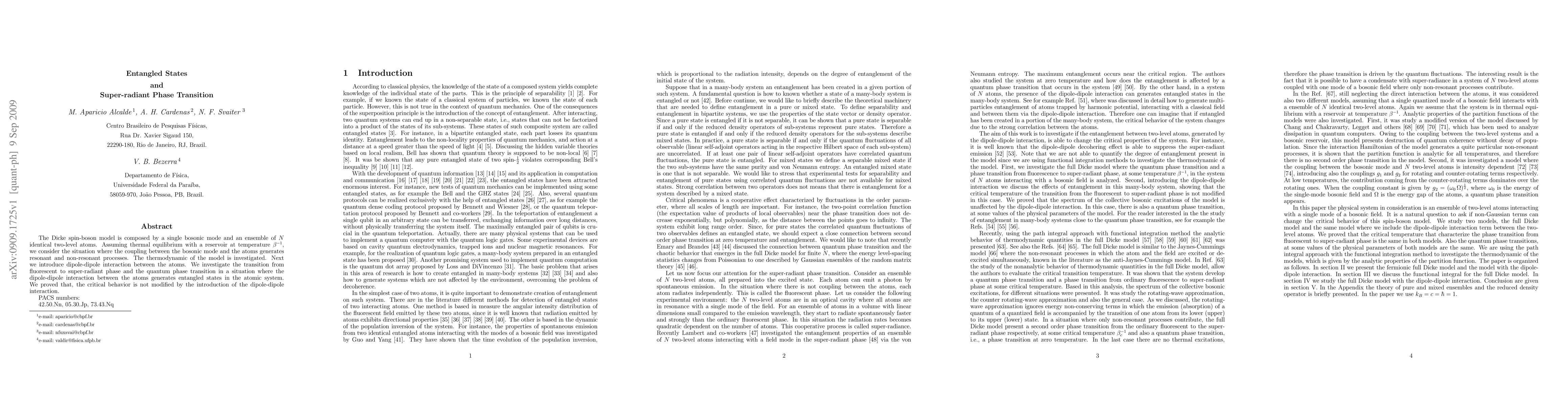 The Dicke spin-boson model is composed by a single bosonic mode and an ensemble of $N$ identical two-level atoms. Assuming thermal equilibrium with a reservoir at temperature $\beta^{-1}$, we consider the situation where the coupling between the bosonic mode and the atoms generates resonant and non-resonant processes. The thermodynamic of the model is investigated. Next we introduce dipole-dipole interaction between the atoms. We investigate the transition from fluorescent to super-radiant phase and the quantum phase transition in a situation where the dipole-dipole interaction between the atoms generates entangled states in the atomic system. We proved that, the critical behavior is not modified by the introduction of the dipole-dipole interaction.
