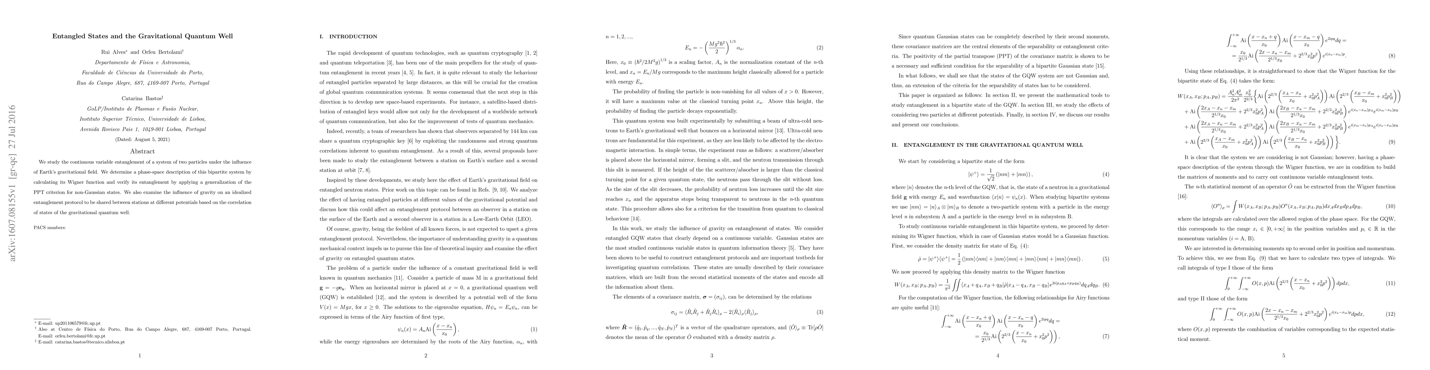 We study the continuous variable entanglement of a system of two particles under the influence of Earth's gravitational field. We determine a phase-space description of this bipartite system by calculating its Wigner function and verify its entanglement by applying a generalization of the PPT criterion for non-Gaussian states. We also examine the influence of gravity on an idealized entanglement protocol to be shared between stations at different potentials based on the correlation of states of the gravitational quantum well.