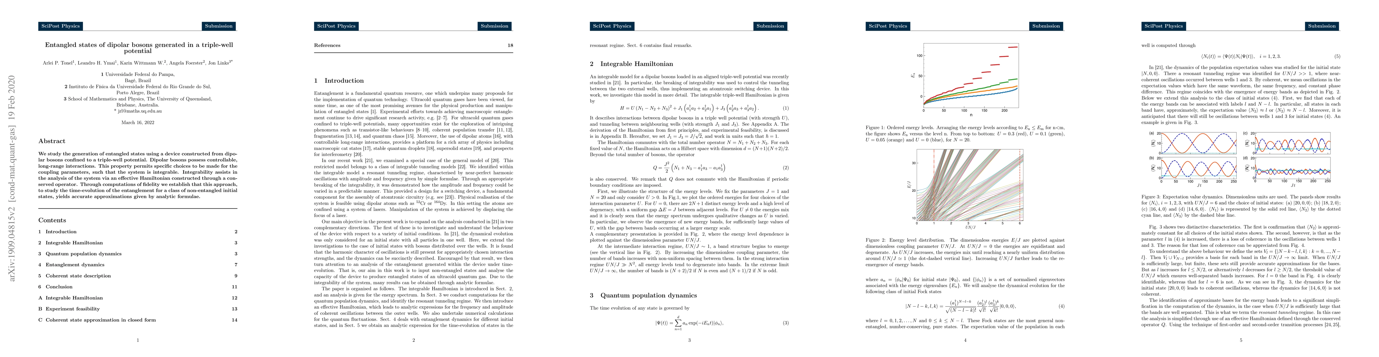 We study the generation of entangled states using a device constructed from dipolar bosons confined to a triple-well potential. Dipolar bosons possess controllable, long-range interactions. This property permits specific choices to be made for the coupling parameters, such that the system is integrable. Integrability assists in the analysis of the system via an effective Hamiltonian constructed through a conserved operator. Through computations of fidelity we establish that this approach, to study the time-evolution of the entanglement for a class of non-entangled initial states, yields accurate approximations given by analytic formulae.