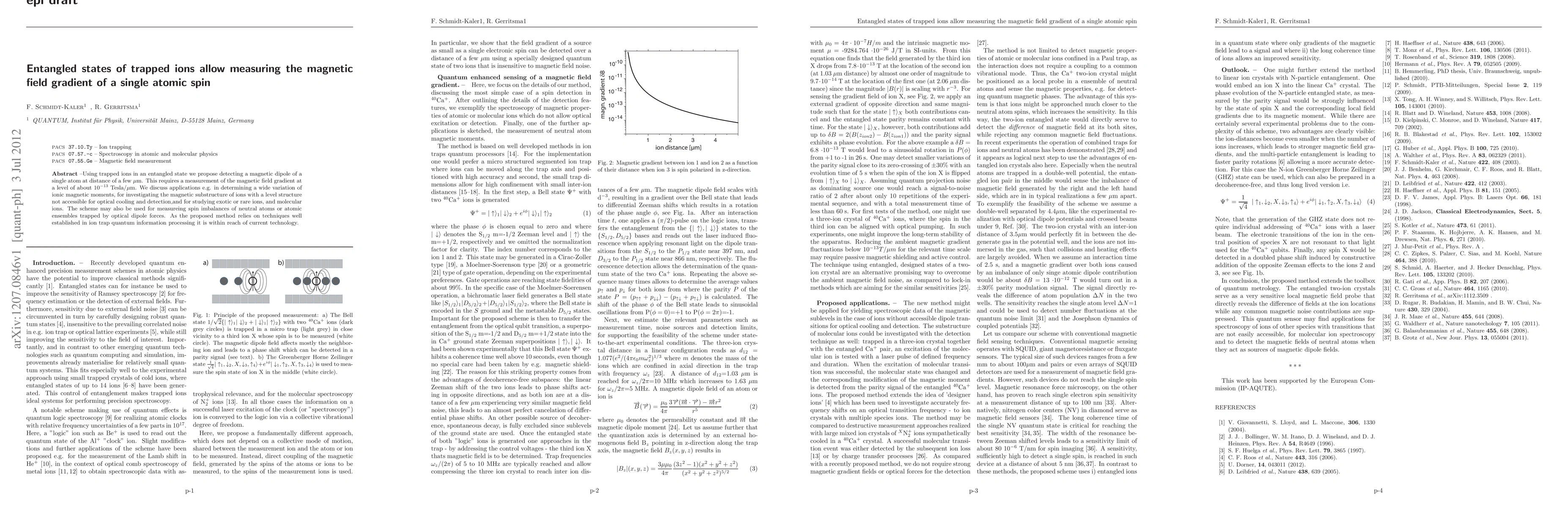 This paper proposes a method to detect the magnetic field gradient of a single atomic spin using entangled states of trapped ions, requiring a sensitivity of about 10$^{-13}$ Tesla/$\mu$m. The technique could determine ionic magnetic moments and investigate rare or complex ions, and is feasible with current ion trap technology.