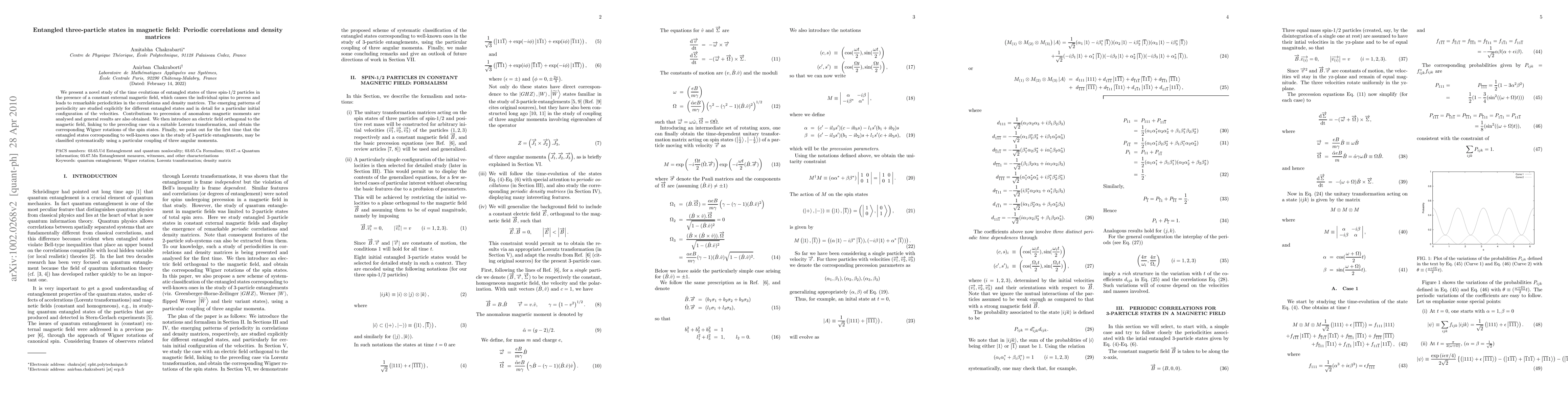 We present a novel study of the time evolutions of entangled states of three spin-1/2 particles in the presence of a constant external magnetic field, which causes the individual spins to precess and leads to remarkable periodicities in the correlations and density matrices. The emerging patterns of periodicity are studied explicitly for different entangled states and in detail for a particular initial configuration of the velocities. Contributions to precession of anomalous magnetic moments are analysed and general results are also obtained. We then introduce an electric field orthogonal to the magnetic field, linking to the preceding case via a suitable Lorentz transformation, and obtain the corresponding Wigner rotations of the spin states. Finally, we point out for the first time that the entangled states corresponding to well-known ones in the study of 3-particle entanglements, may be classified systematically using a particular coupling of three angular momenta.