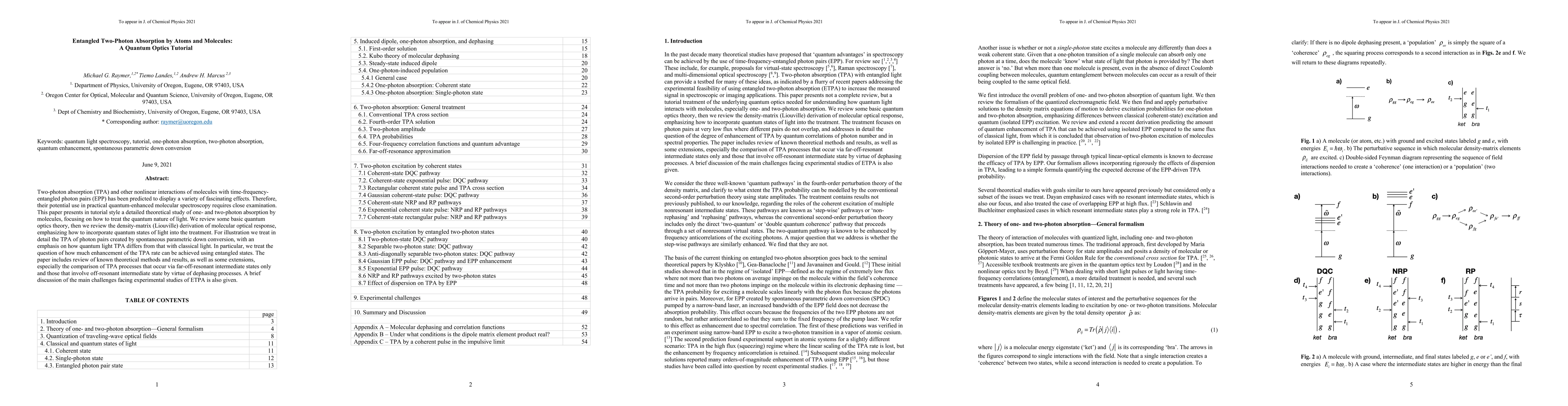 This paper provides a detailed theoretical study of one- and two-photon absorption by molecules using quantum optics, focusing on the effects of time-frequency-entangled photon pairs. It reviews quantum optics theory and the density-matrix derivation of molecular optical response, comparing entangled TPA with classical light and discussing potential enhancements.