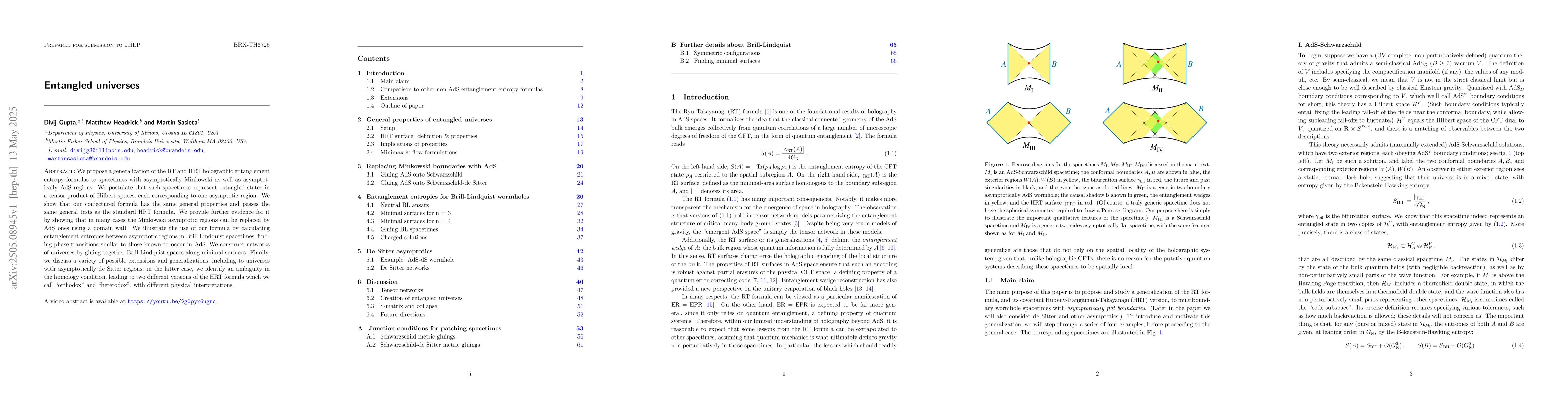 We propose a generalization of the RT and HRT holographic entanglement entropy formulas to spacetimes with asymptotically Minkowski as well as asymptotically AdS regions. We postulate that such spacetimes represent entangled states in a tensor product of Hilbert spaces, each corresponding to one asymptotic region. We show that our conjectured formula has the same general properties and passes the same general tests as the standard HRT formula. We provide further evidence for it by showing that in many cases the Minkowski asymptotic regions can be replaced by AdS ones using a domain wall. We illustrate the use of our formula by calculating entanglement entropies between asymptotic regions in Brill-Lindquist spacetimes, finding phase transitions similar to those known to occur in AdS. We construct networks of universes by gluing together Brill-Lindquist spaces along minimal surfaces. Finally, we discuss a variety of possible extensions and generalizations, including to universes with asymptotically de Sitter regions; in the latter case, we identify an ambiguity in the homology condition, leading to two different versions of the HRT formula which we call ``orthodox'' and ``heterodox'', with different physical interpretations.