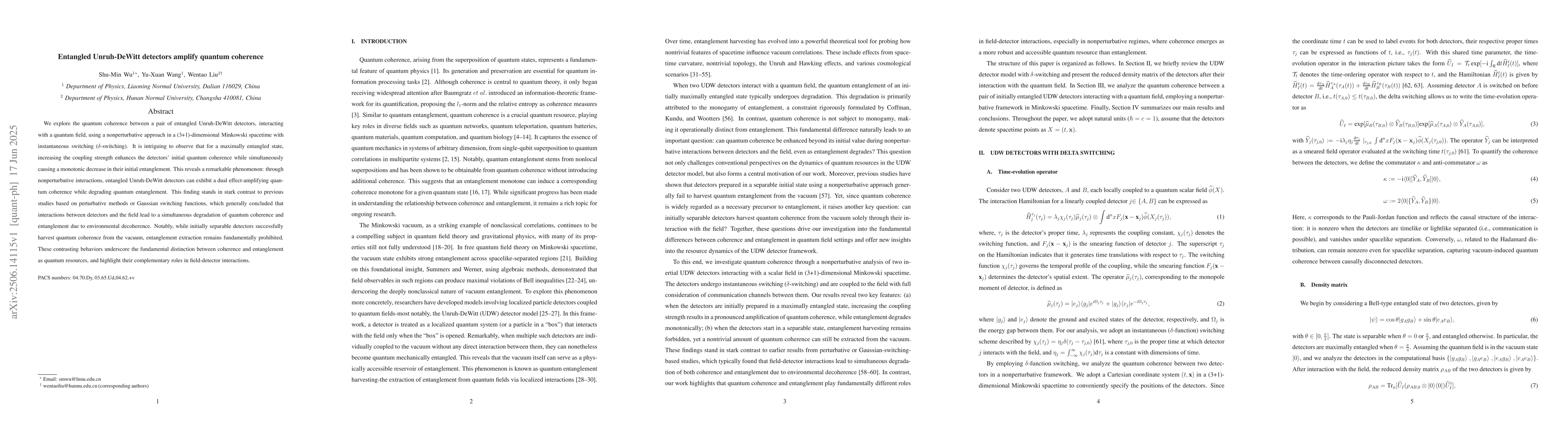 We explore the quantum coherence between a pair of entangled Unruh-DeWitt detectors, interacting with a quantum field, using a nonperturbative approach in a (3+1)-dimensional Minkowski spacetime with instantaneous switching ($\delta$-switching). It is intriguing to observe that for a maximally entangled state, increasing the coupling strength enhances the detectors' initial quantum coherence while simultaneously causing a monotonic decrease in their initial entanglement. This reveals a remarkable phenomenon: through nonperturbative interactions, entangled Unruh-DeWitt detectors can exhibit a dual effect-amplifying quantum coherence while degrading quantum entanglement. This finding stands in stark contrast to previous studies based on perturbative methods or Gaussian switching functions, which generally concluded that interactions between detectors and the field lead to a simultaneous degradation of quantum coherence and entanglement due to environmental decoherence. Notably, while initially separable detectors successfully harvest quantum coherence from the vacuum, entanglement extraction remains fundamentally prohibited. These contrasting behaviors underscore the fundamental distinction between coherence and entanglement as quantum resources, and highlight their complementary roles in field-detector interactions.