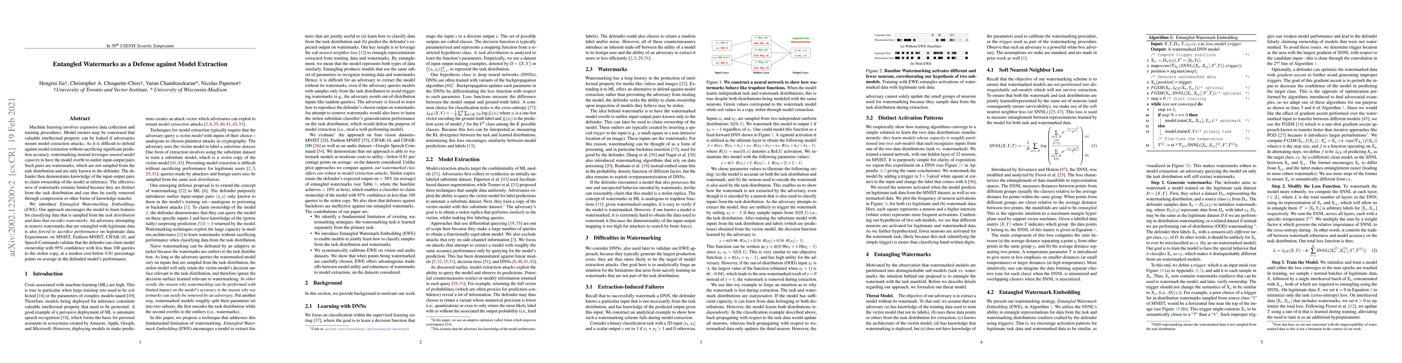 Researchers introduce Entangled Watermarking Embeddings to defend against model extraction attacks by leveraging unused model capacity to overfit to outlier input-output pairs, allowing defenders to claim ownership of the model with high confidence.