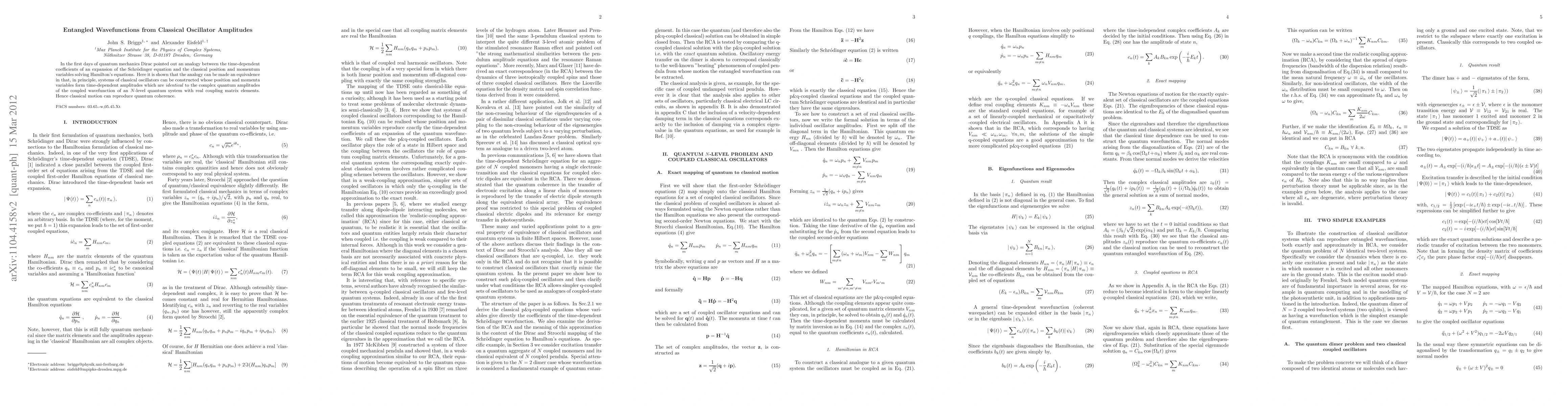In the first days of quantum mechanics Dirac pointed out an analogy between the time-dependent coefficients of an expansion of the Schr\"odinger equation and the classical position and momentum variables solving Hamilton's equations. Here it is shown that the analogy can be made an equivalence in that, in principle, systems of classical oscillators can be constructed whose position and momenta variables form time-dependent amplitudes which are identical to the complex quantum amplitudes of the coupled wavefunction of an N-level quantum system with real coupling matrix elements. Hence classical motion can reproduce quantum coherence.