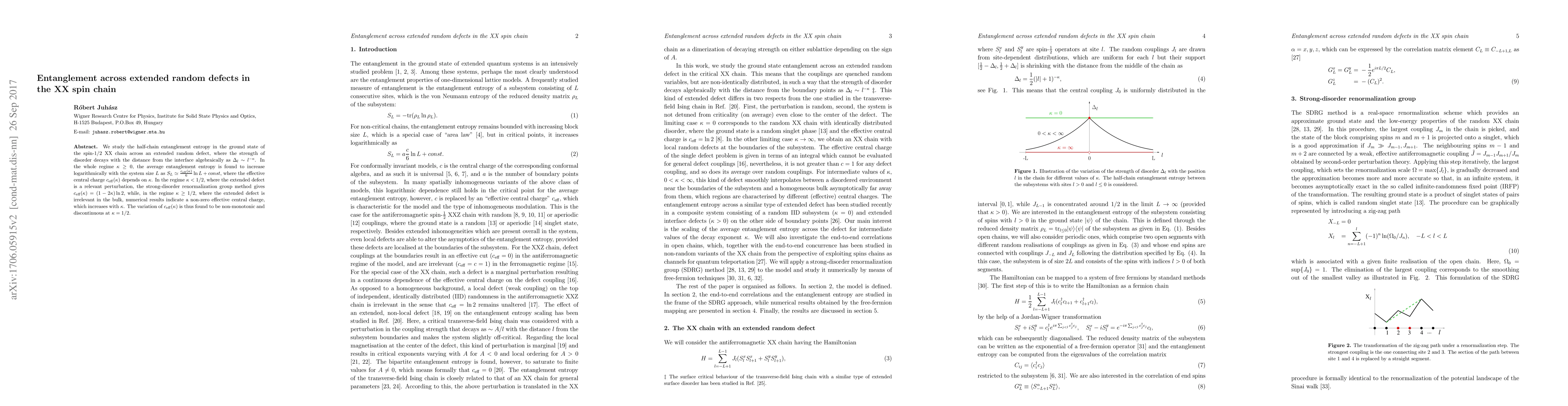 We study the half-chain entanglement entropy in the ground state of the spin-1/2 XX chain across an extended random defect, where the strength of disorder decays with the distance from the interface algebraically as $\Delta_l\sim l^{-\kappa}$. In the whole regime $\kappa\ge 0$, the average entanglement entropy is found to increase logarithmically with the system size $L$ as $S_L\simeq\frac{c_{\rm eff}(\kappa)}{6}\ln L+const$, where the effective central charge $c_{\rm eff}(\kappa)$ depends on $\kappa$. In the regime $\kappa<1/2$, where the extended defect is a relevant perturbation, the strong-disorder renormalization group method gives $c_{\rm eff}(\kappa)=(1-2\kappa)\ln2$, while, in the regime $\kappa\ge 1/2$, where the extended defect is irrelevant in the bulk, numerical results indicate a non-zero effective central charge, which increases with $\kappa$. The variation of $c_{\rm eff}(\kappa)$ is thus found to be non-monotonic and discontinuous at $\kappa=1/2$.