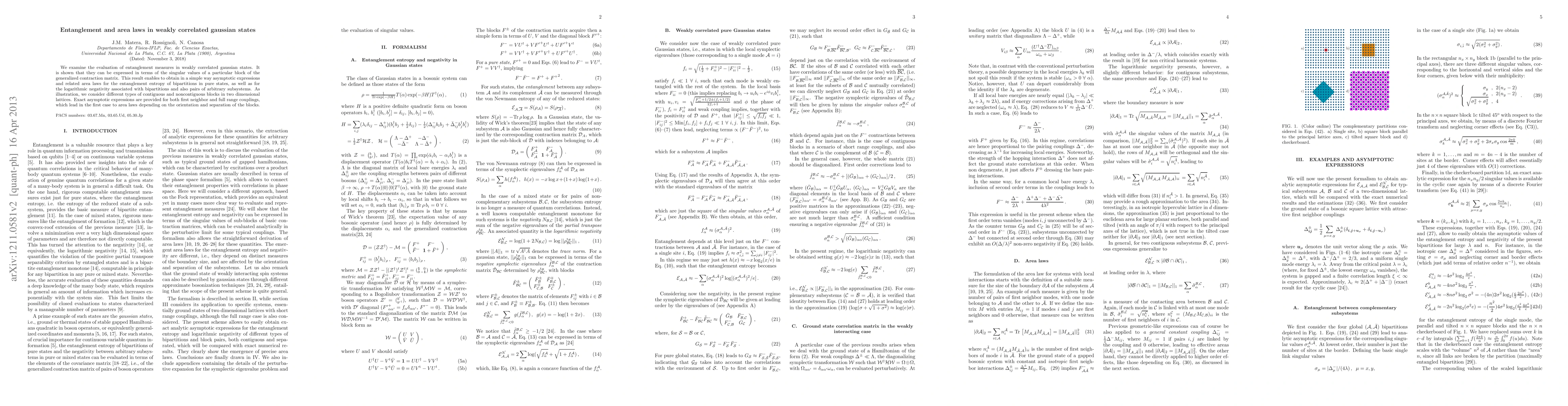 We examine the evaluation of entanglement measures in weakly correlated gaussian states. It is shown that they can be expressed in terms of the singular values of a particular block of the generalized contraction matrix. This result enables to obtain in a simple way asymptotic expressions and related area laws for the entanglement entropy of bipartitions in pure states, as well as for the logarithmic negativity associated with bipartitions and also pairs of arbitrary subsystems. As illustration, we consider different types of contiguous and noncontiguous blocks in two dimensional lattices. Exact asymptotic expressions are provided for both first neighbor and full range couplings, which lead in the first case to area laws depending on the orientation and separation of the blocks.
