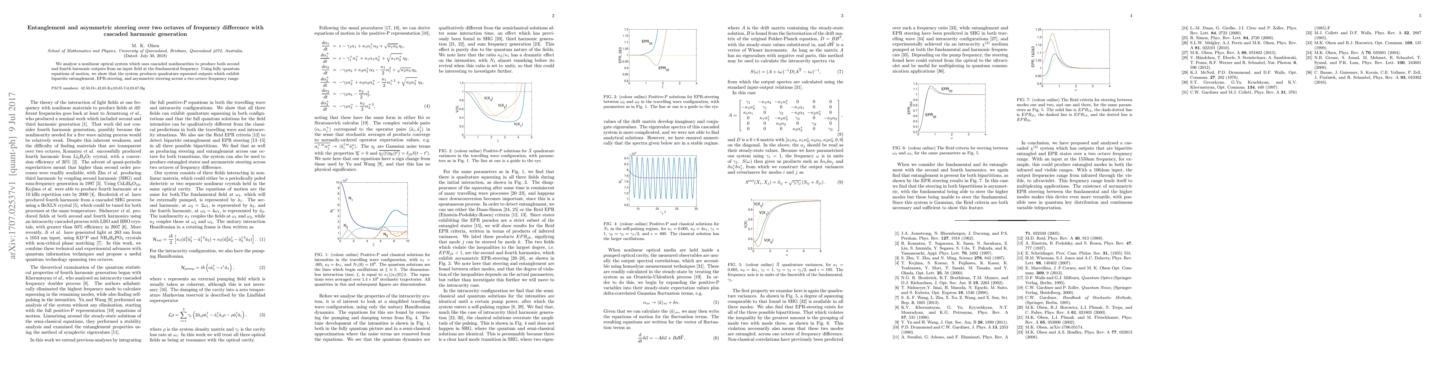 This paper explores a nonlinear optical system utilizing cascaded harmonic generation to produce both second and fourth harmonics, demonstrating entanglement, EPR-steering, and asymmetric steering across a two-octave frequency range through quantum equations of motion. The system's outputs exhibit quadrature squeezed states, highlighting its potential for quantum information applications.