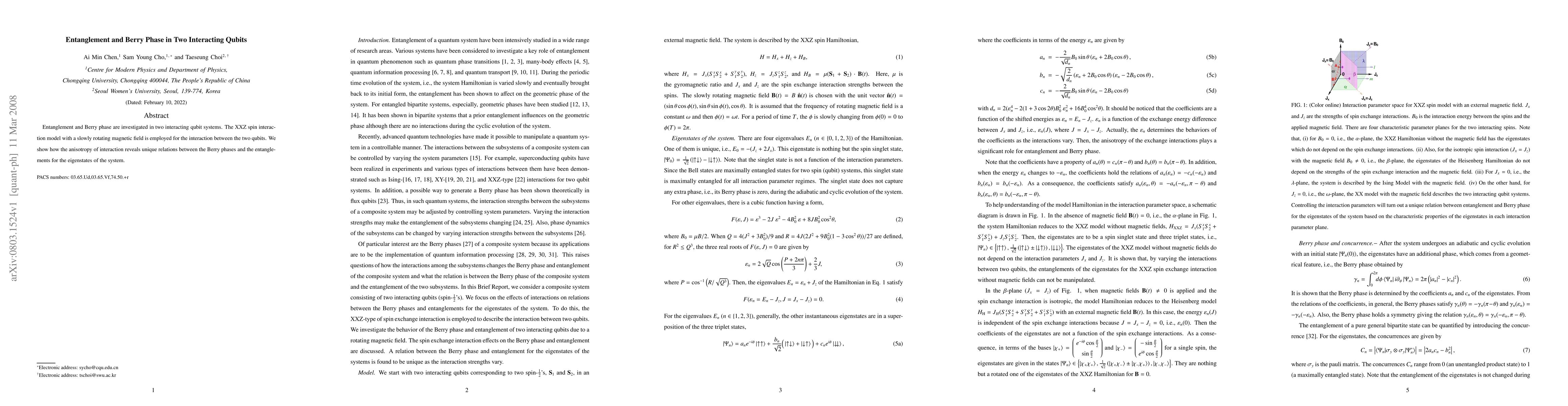 This paper explores entanglement and Berry phase dynamics in two interacting qubits using the XXZ spin interaction model under a slowly rotating magnetic field. The study reveals unique relationships between the anisotropy of interaction, the Berry phases, and the entanglements of the system's eigenstates.