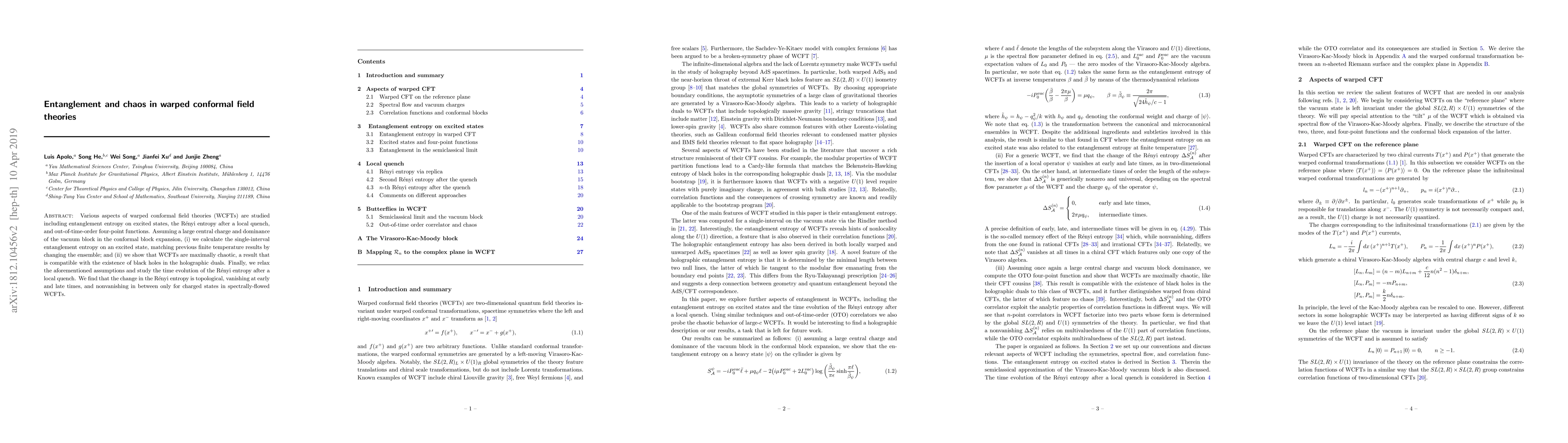 Various aspects of warped conformal field theories (WCFTs) are studied including entanglement entropy on excited states, the Renyi entropy after a local quench, and out-of-time-order four-point functions. Assuming a large central charge and dominance of the vacuum block in the conformal block expansion, (i) we calculate the single-interval entanglement entropy on an excited state, matching previous finite temperature results by changing the ensemble; and (ii) we show that WCFTs are maximally chaotic, a result that is compatible with the existence of black holes in the holographic duals. Finally, we relax the aforementioned assumptions and study the time evolution of the Renyi entropy after a local quench. We find that the change in the Renyi entropy is topological, vanishing at early and late times, and nonvanishing in between only for charged states in spectrally-flowed WCFTs.