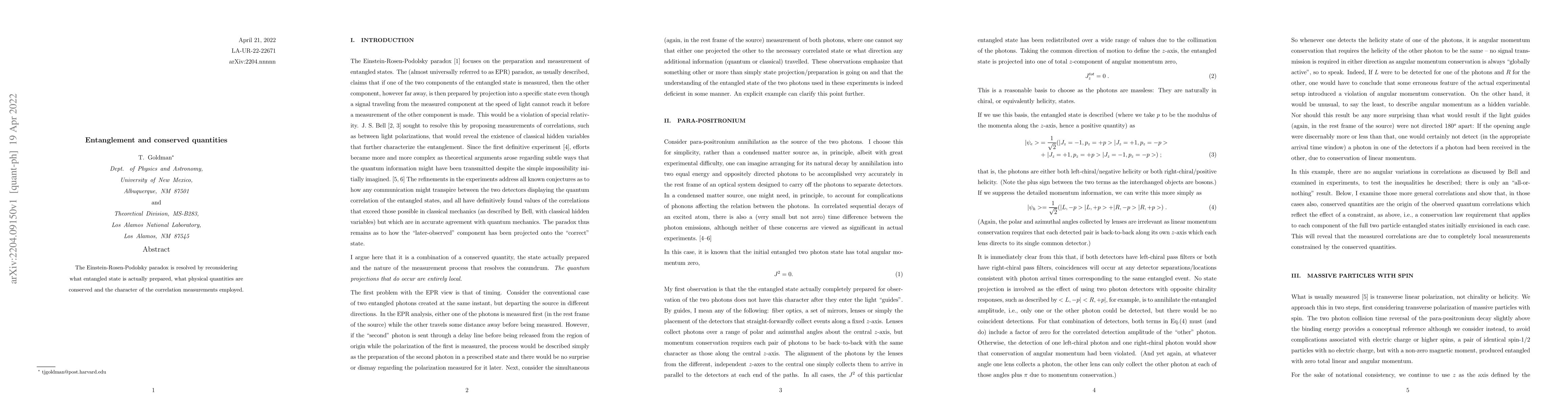 Summary: This paper resolves the Einstein-Podolsky-Rosen paradox by reexamining the nature of entangled states, identifying conserved physical quantities, and analyzing the implications of measurement correlations. The findings suggest a new understanding of entanglement and its associated properties.