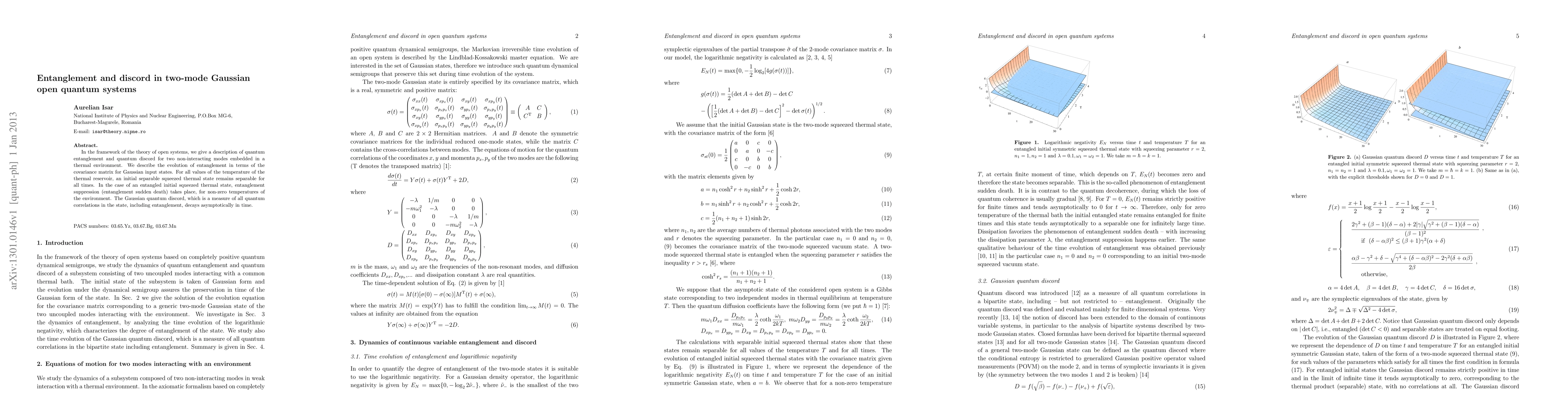 In the framework of the theory of open systems, we give a description of quantum entanglement and quantum discord for two non-interacting modes embedded in a thermal environment. We describe the evolution of entanglement in terms of the covariance matrix for Gaussian input states. For all values of the temperature of the thermal reservoir, an initial separable squeezed thermal state remains separable for all times. In the case of an entangled initial squeezed thermal state, entanglement suppression (entanglement sudden death) takes place, for non-zero temperatures of the environment. The Gaussian quantum discord, which is a measure of all quantum correlations in the state, including entanglement, decays asymptotically in time.