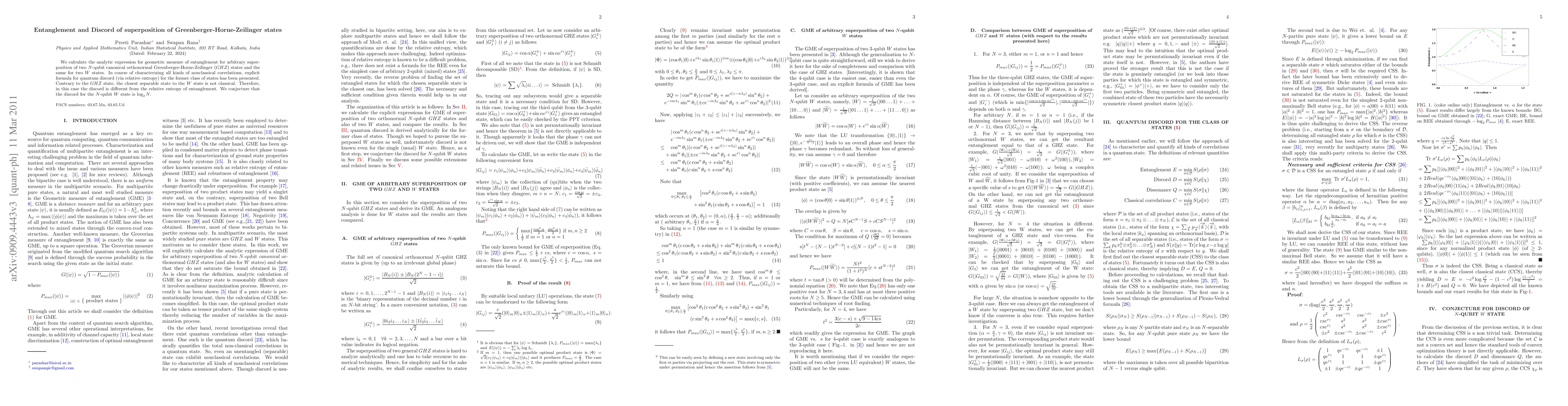 This paper derives the analytic expressions for the entanglement and discord of superpositions of two $N$-qubit Greenberger-Horne-Zeilinger (GHZ) states and $W$ states. It finds that while the discord for GHZ states can be expressed via relative entropy, the discord for $W$ states differs due to the non-classical nature of their closest separable state, with a conjectured value of $\log_2N$.
