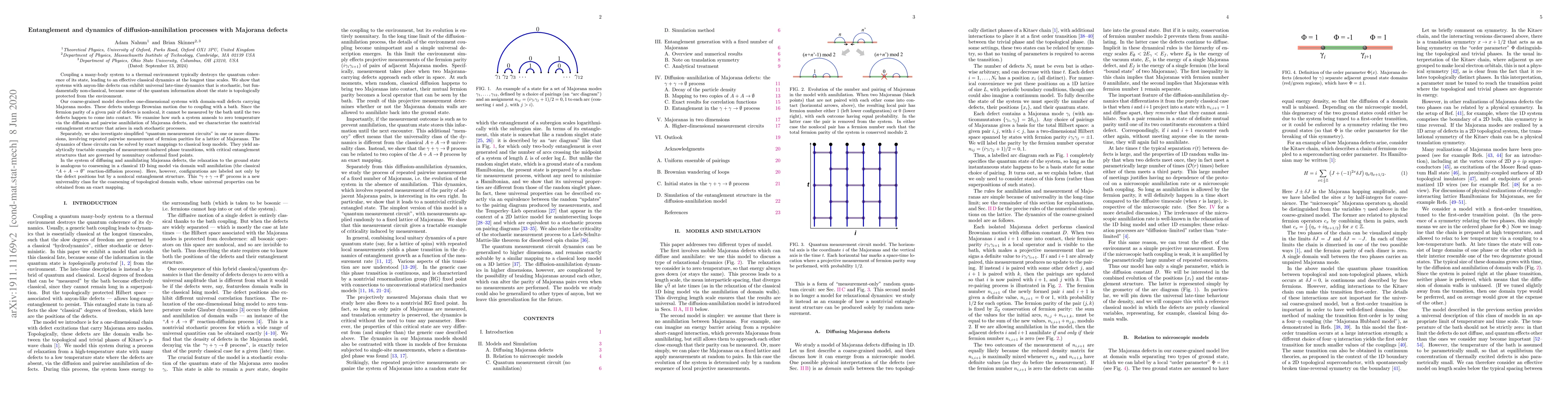 Coupling a many-body system to a thermal environment typically destroys the quantum coherence of its state, leading to an effective classical dynamics at the longest time scales. We show that systems with anyon-like defects can exhibit universal late-time dynamics that is stochastic, but fundamentally non-classical, because some of the quantum information about the state is topologically protected from the environment. Our coarse-grained model describes one-dimensional systems with domain-wall defects carrying Majorana modes. These defects undergo Brownian motion due to coupling with a bath. Since the fermion parity of a given pair of defects is nonlocal, it cannot be measured by the bath until the two defects happen to come into contact. We examine how such a system anneals to zero temperature via the diffusion and pairwise annihilation of Majorana defects, and we characterize the nontrivial entanglement structure that arises in such stochastic processes. Separately, we also investigate simplified "quantum measurement circuits" in one or more dimensions, involving repeated pairwise measurement of fermion parities for a lattice of Majoranas. The dynamics of these circuits can be solved by exact mappings to classical loop models. They yield analytically tractable examples of measurement-induced phase transitions, with critical entanglement structures that are governed by nonunitary conformal fixed points. In the system of diffusing and annihilating Majorana defects, the relaxation to the ground state is analogous to coarsening in a classical 1D Ising model via domain wall annihilation. Here, however, configurations are labeled not only by the defect positions but by a nonlocal entanglement structure. The resulting dynamical process is a new universality class for the coarsening of topological domain walls, whose universal properties can be obtained from an exact mapping.