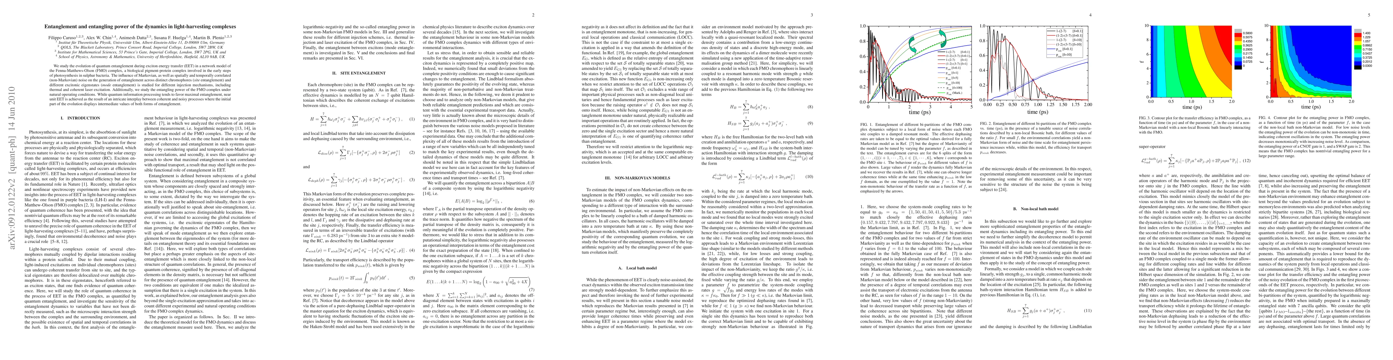 This study investigates quantum entanglement dynamics in the Fenna-Matthews-Olson complex during exciton energy transfer, exploring the effects of different noise types on entanglement generation and the complex's entangling power. The research finds that near-perfect energy transfer results from a balance between coherent and noisy processes, showcasing intermediate entanglement levels.