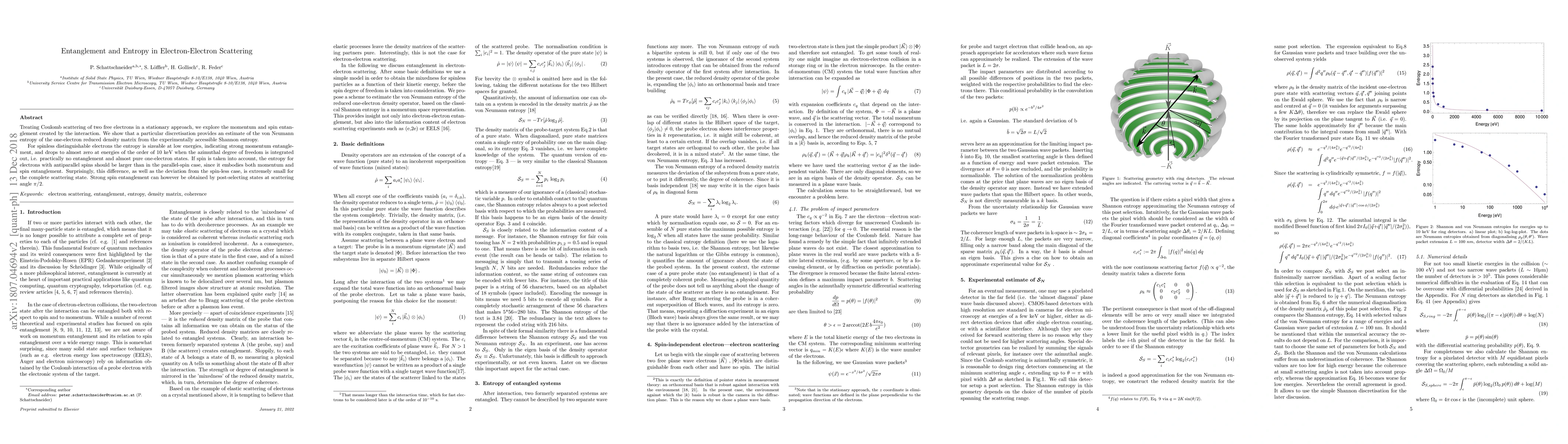 This paper investigates the entanglement and entropy generated during electron-electron Coulomb scattering, revealing that low-energy interactions produce significant momentum entanglement, which diminishes at higher energies. The study finds minimal difference in entropy between parallel and antiparallel spin states, despite theoretical expectations, suggesting strong spin entanglement can be observed under specific conditions.