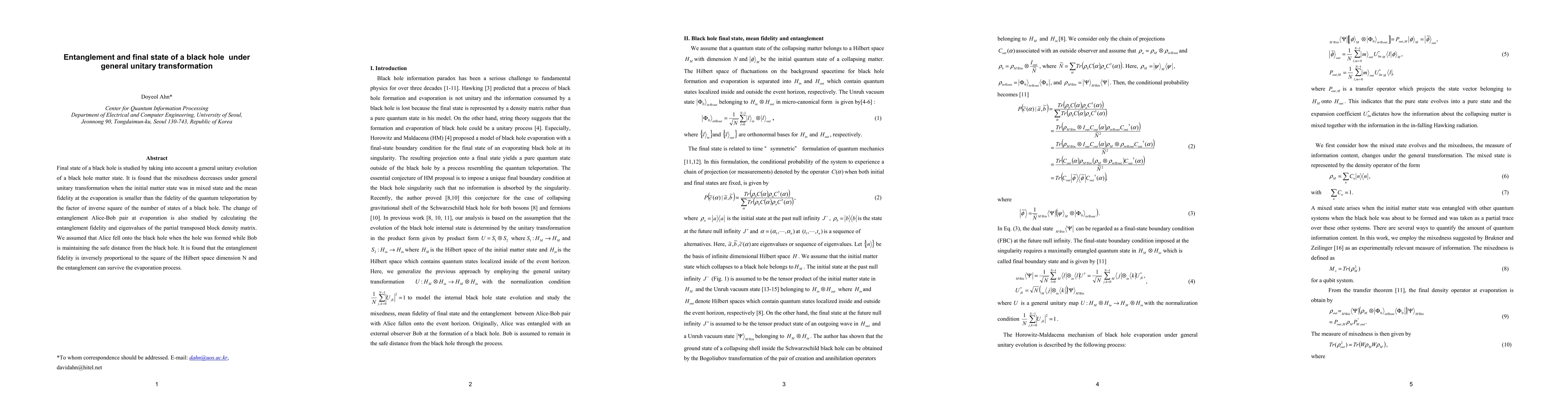 This paper investigates the final state of a black hole under general unitary transformations, finding that mixedness decreases when initial states are mixed, and mean fidelity at evaporation is lower than quantum teleportation fidelity. It also examines entanglement between Alice and Bob, showing that the entanglement fidelity inversely correlates with the square of the Hilbert space dimension, and that entanglement can persist through the evaporation process.