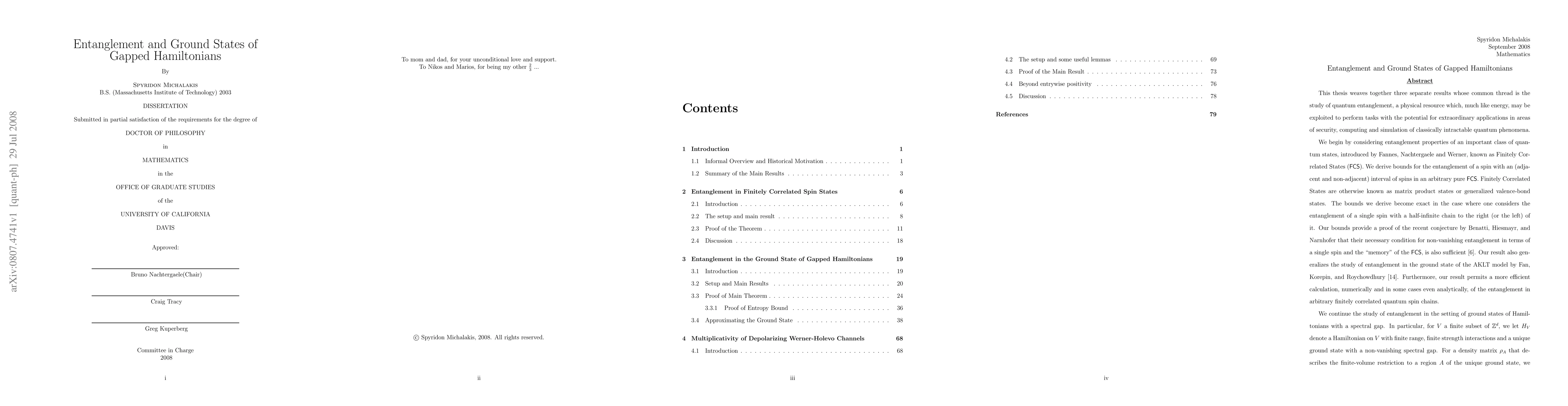 We begin by deriving bounds for the entanglement of a spin with an (adjacent and non-adjacent) interval of spins in an arbitrary pure Finitely Correlated States (FCS). The bounds we derive become exact in the case where one considers the entanglement of a single spin with a half-infinite chain to the right of it. Our result permits a more efficient calculation, numerically and in some cases even analytically, of the entanglement in arbitrary finitely correlated quantum spin chains. We continue the study of entanglement in the setting of ground states of Hamiltonians with a spectral gap. In particular, for $V$ a finite subset of $Z^d$, we let $H_V$ denote a Hamiltonian on $V$ with finite range, finite strength interactions and a unique ground state with a non-vanishing spectral gap. For a density matrix $\rho_A$ that describes the finite-volume restriction to a region $A$ of the unique ground state, we provide a detailed version of a proof by M. Hastings, that the entropy of $\rho_A$ is bounded by a uniform constant $C$. Moreover, we provide a detailed generalization of the 1-dimensional construction of Hastings' approximation to the ground state in dimensions 2 and higher. Finally, we turn our attention to the study of a conjecture central to Quantum Information Theory, the multiplicativity of the maximal output Schatten $p$-norm of quantum channels, for $p > 1$. In particular, we study the output 2-norm for a special class of quantum channels, the depolarized Werner-Holevo channels, and show that multiplicativity holds for a product of two identical channels in this class.