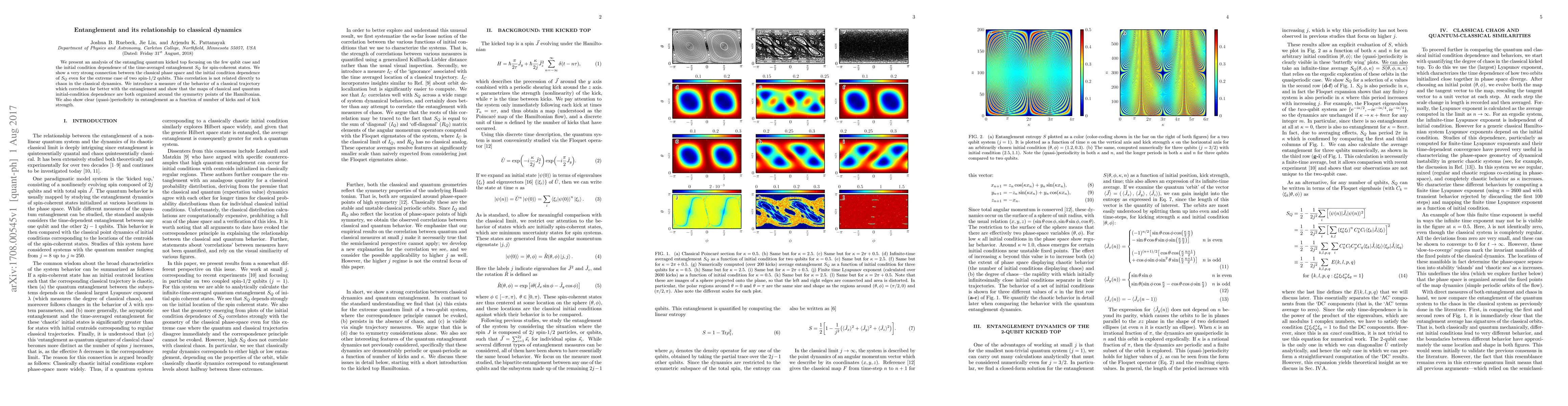 We present an analysis of the entangling quantum kicked top focusing on the few qubit case and the initial condition dependence of the time-averaged entanglement $S_Q$ for spin-coherent states. We show a very strong connection between the classical phase space and the initial condition dependence of $S_Q$ even for the extreme case of two spin-$1/2$ qubits. This correlation is not related directly to chaos in the classical dynamics. We introduce a measure of the behavior of a classical trajectory which correlates far better with the entanglement and show that the maps of classical and quantum initial-condition dependence are both organized around the symmetry points of the Hamiltonian. We also show clear (quasi-)periodicity in entanglement as a function of number of kicks and of kick strength.