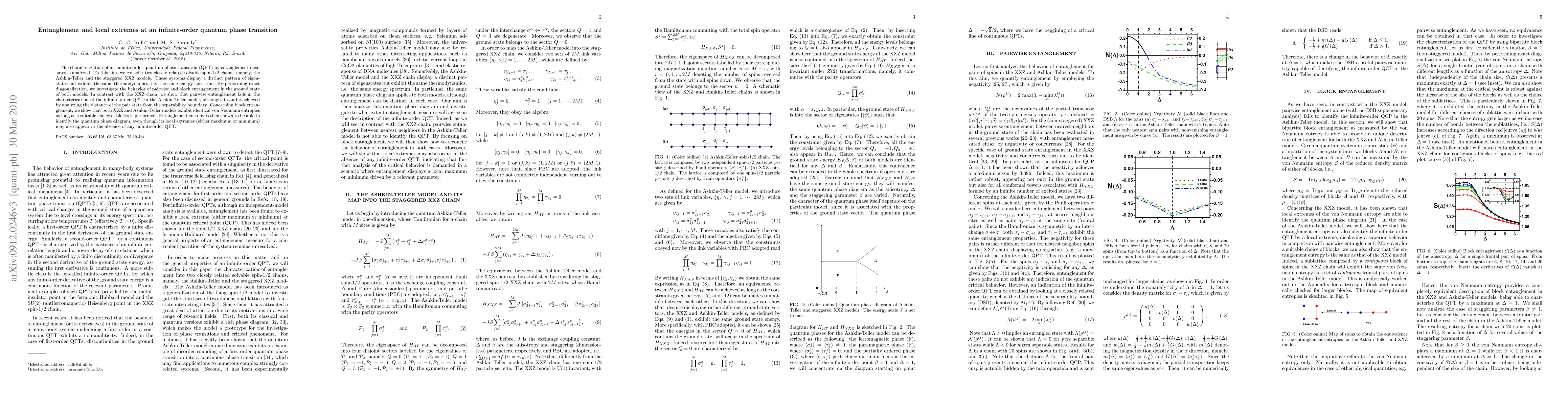 This paper investigates entanglement measures in infinite-order quantum phase transitions using the Ashkin-Teller and staggered XXZ spin-1/2 chains. While pairwise entanglement fails to characterize the transition in the Ashkin-Teller model, block entanglement reveals identical von Neumann entropies for both models under specific conditions, highlighting entanglement's role in identifying the quantum phase diagram despite local extremes.