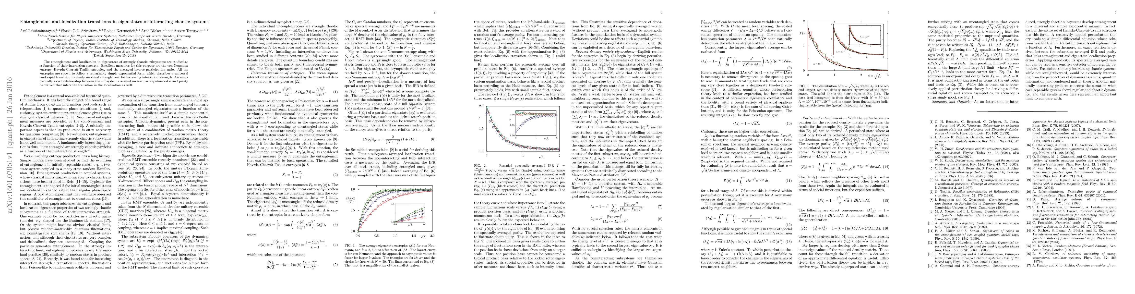 This paper investigates the entanglement and localization transitions in eigenstates of strongly chaotic subsystems as a function of interaction strength, using measures like von-Neumann entropy and the averaged inverse participation ratio. The study reveals a universal exponential transition to maximal entanglement and derives an exact relationship between the subsystem averaged inverse participation ratio and purity to infer localization transitions.