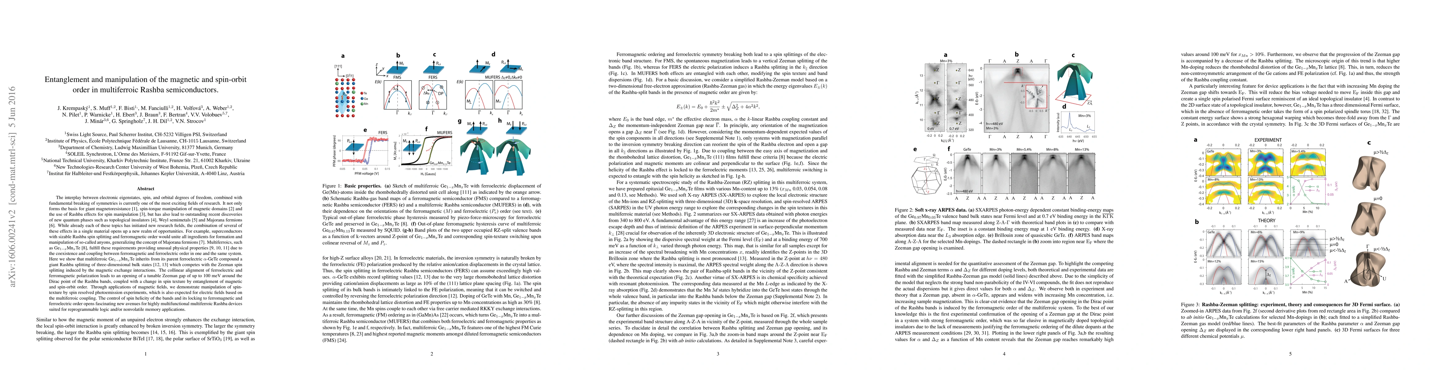 This paper investigates the manipulation of magnetic and spin-orbit order in multiferroic (GeMn)Te, revealing a tunable Zeeman gap and spin texture changes due to the interplay between ferroelectric and ferromagnetic polarization. The study demonstrates potential for controlling spin helicity, paving the way for multifunctional devices in logic and memory applications.