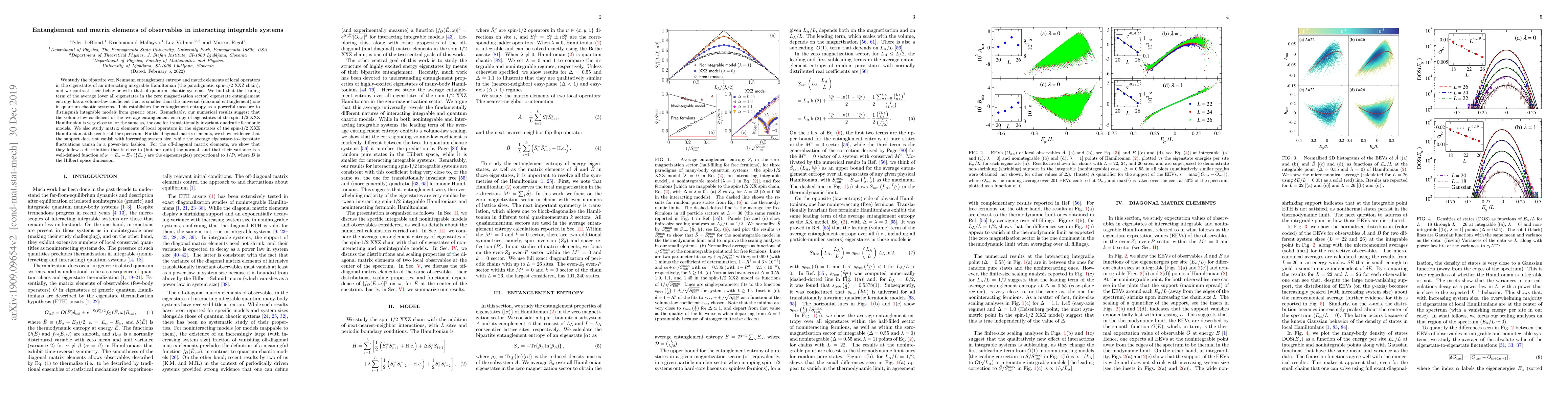 This paper investigates the bipartite von Neumann entanglement entropy and matrix elements of local operators in the eigenstates of the spin-1/2 XXZ chain, revealing that its average entanglement entropy has a smaller volume-law coefficient than in quantum chaotic systems, distinguishing integrable models. It also finds that the matrix elements exhibit a distribution close to log-normal and their variance scales inversely with the Hilbert space dimension.