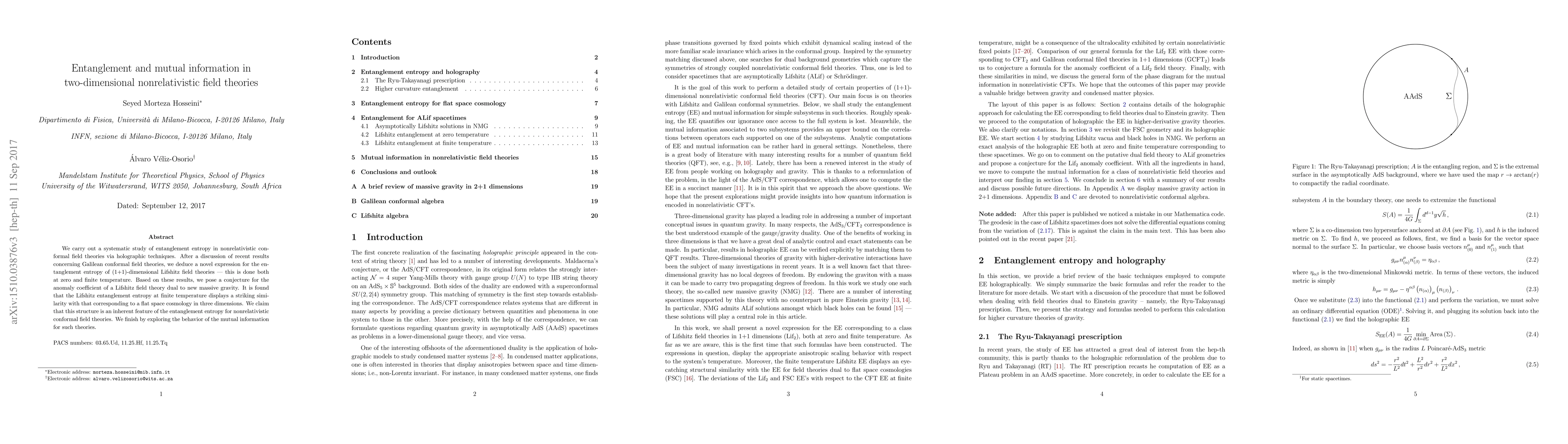 This paper systematically studies entanglement entropy in nonrelativistic conformal field theories using holographic techniques, deriving a novel expression for Lifshitz field theories at both zero and finite temperature. It conjectures an anomaly coefficient for a Lifshitz field theory dual to new massive gravity and explores mutual information behavior in these theories.