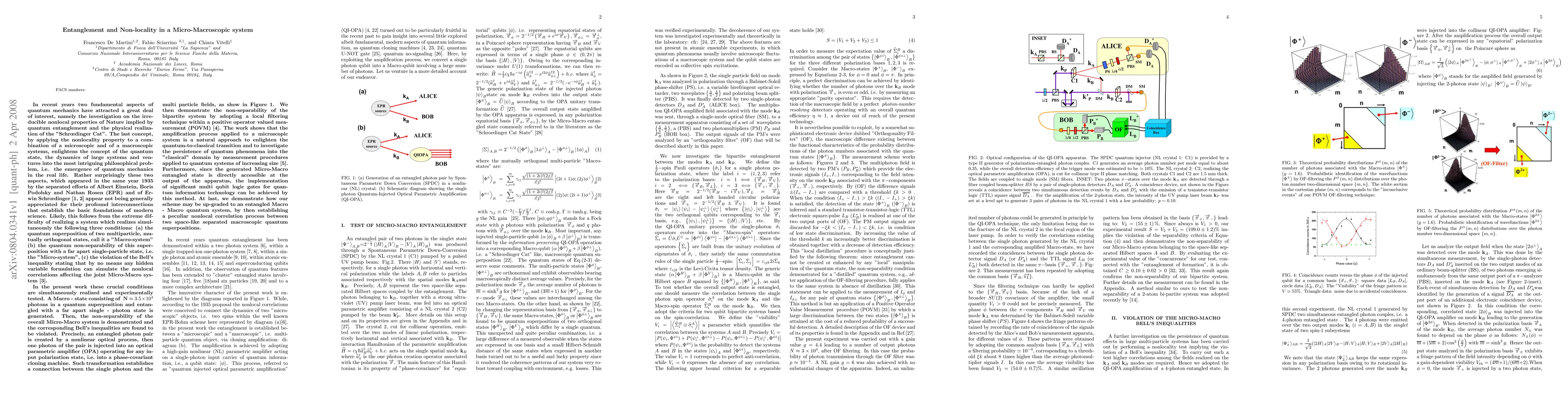 In recent years two fundamental aspects of quantum mechanics have attracted a great deal of interest, namely the investigation on the irreducible nonlocal properties of Nature implied by quantum entanglement and the physical realization of the 'Schroedinger Cat'. In the present work a macro - state consisting of about 3.5 x 10^4 photons in a quantum superposition and entangled with a far apart single - photon state is generated. Then, the non-separability of the overall micro-macro system is demonstrated and the corresponding Bell's inequalities are found to be violated. Precisely, an entangled photon pair is created by a nonlinear optical process, then one photon of the pair is injected into an optical parametric amplifier operating for any input polarization state, i.e. into a phase-covariant cloning machine. Such transformation establishes a connection between the single photon and the multi particle fields. We then demonstrate the non-separability of the bipartite system by adopting a local filtering technique within a positive operator valued measurement.