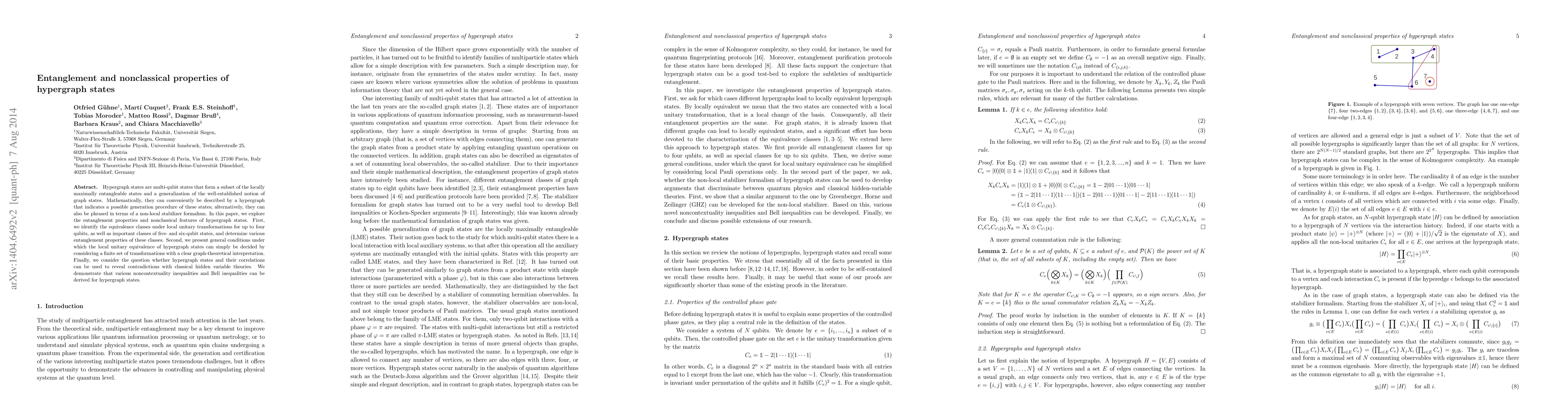 Hypergraph states are multi-qubit states that form a subset of the locally maximally entangleable states and a generalization of the well--established notion of graph states. Mathematically, they can conveniently be described by a hypergraph that indicates a possible generation procedure of these states; alternatively, they can also be phrased in terms of a non-local stabilizer formalism. In this paper, we explore the entanglement properties and nonclassical features of hypergraph states. First, we identify the equivalence classes under local unitary transformations for up to four qubits, as well as important classes of five- and six-qubit states, and determine various entanglement properties of these classes. Second, we present general conditions under which the local unitary equivalence of hypergraph states can simply be decided by considering a finite set of transformations with a clear graph-theoretical interpretation. Finally, we consider the question whether hypergraph states and their correlations can be used to reveal contradictions with classical hidden variable theories. We demonstrate that various noncontextuality inequalities and Bell inequalities can be derived for hypergraph states.