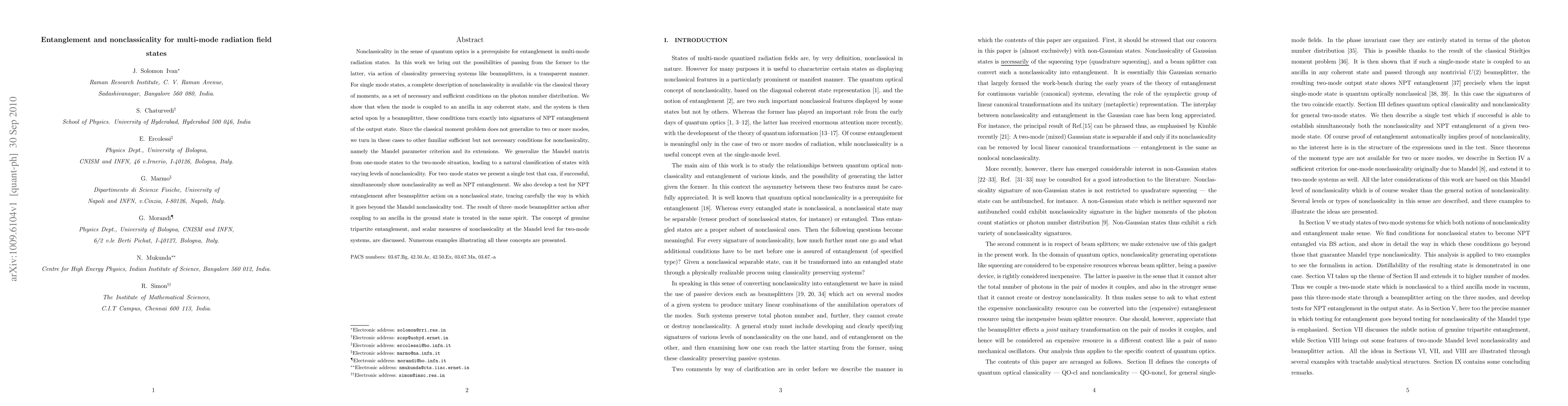 This paper explores the transition from nonclassicality to entanglement in multi-mode radiation fields via beamsplitters. It introduces a method to detect nonclassicality and NPT entanglement in two-mode states using generalized Mandel matrices and presents a unified test for both properties.