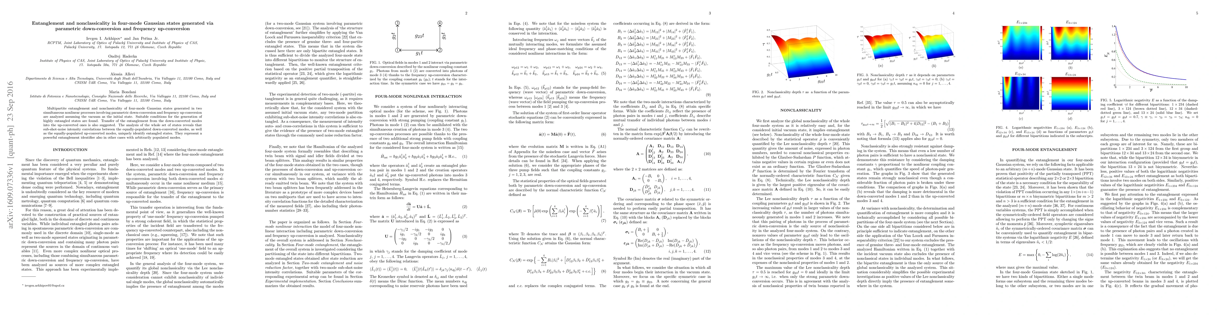 This paper analyzes the multipartite entanglement and nonclassicality in four-mode Gaussian states generated through parametric down-conversion and frequency up-conversion. It identifies conditions for highly entangled states and suggests entanglement transfer between down-converted and up-converted modes, with sub-shot-noise intensity correlations serving as a unique identifier for entangled states.